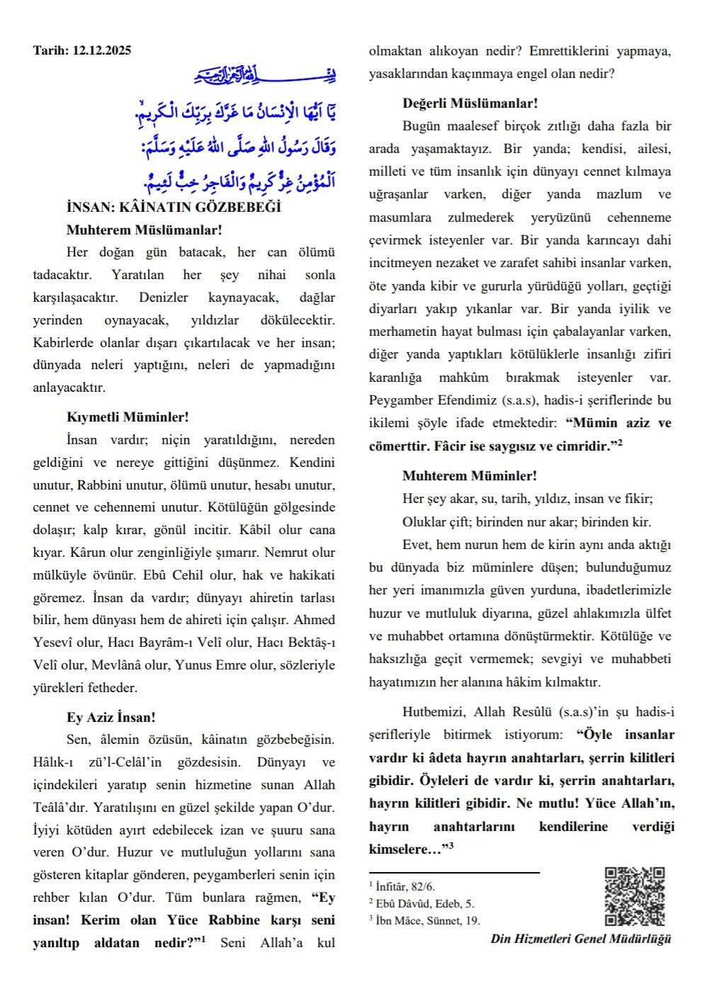 Diyanet İşleri Başkanlığı tarafından hazırlanan 12 Aralık 2025 tarihli Cuma hutbesi, insanın fani dünyadaki konumunu ve ebedi hayata yönelik sorumluluklarını işledi. "İnsan: Kainatın Gözbebeği" başlığıyla idrak edilen hutbe, tüm Müslümanları yeniden tefekkür etmeye ve nefis muhasebesi yapmaya davet etti.