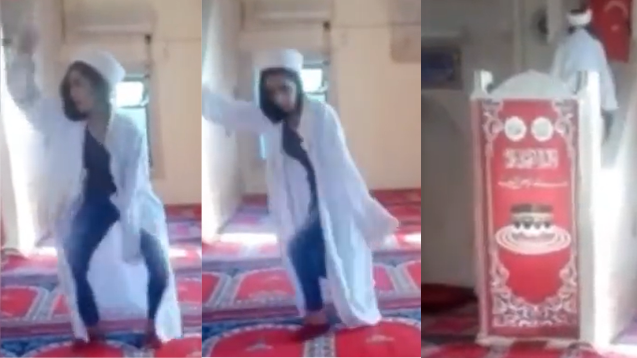 Genç bir kız girdiği camide imamın cübbesini giyerek dans etti.