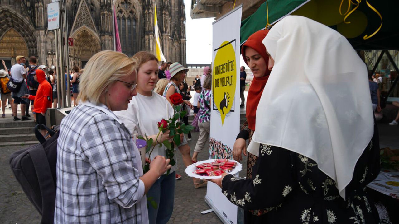Tarihi Köln Katedrali önünde Almanlara ve katedrali gezen turistlere, konuya ilişkin broşür dağıtıldı, Avrupa’da son dönemde başörtülü Müslüman kadınlara yönelik artış gösteren ayrımcılık ve maruz kaldıkları İslamofobik saldırılar anlatıldı.