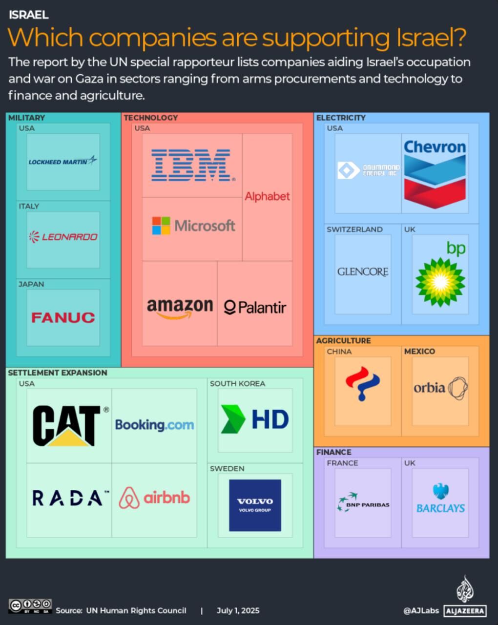 Birleşmiş Milletler (BM) İşgal Altındaki Filistin Toprakları Özel Raportörü Francesca Albanese, İsrail'in Filistinlileri yerinden etmesine ve Gazze'deki soykırım savaşına uluslararası hukuku ihlal ederek yardım eden şirketleri detaylandıran yeni bir rapor yayımladı. Rapor, ABD'li teknoloji devlerinden Avrupalı ve Asyalı sanayi şirketlerine kadar birçok kuruluşun ismini içeriyor.