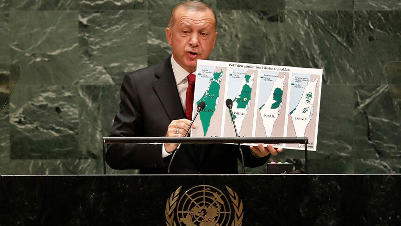 Erdoğan, cumhurbaşkanı sıfatıyla ilk kez 2014'te hitap ettiği BM 69. Genel Kurul hitabında da Filistin sorununu dünya gündemine taşıdı. Sorunun, bölgedeki birçok meselenin temel kaynağı olduğunun altını çizen Erdoğan, "Filistin'de iki-devletli çözümün derhal hayata geçirilmesi, Gazze üzerindeki ablukanın kaldırılması ve İsrail'in yanında bağımsız ve sürdürülebilir bir Filistin devletinin kurulması, siyasi, insani ve ahlaki bir zorunluluktur." ifadelerini kullandı.