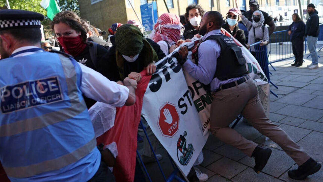 Londra’daki Defence and Security Equipment International (DSEI) silah fuarında, İsrail’in Gazze’deki katliamlarına tepki gösteren binlerce aktivist, İsrail silah şirketlerinin fuara katılımını protesto etti. Fuarda, İsrail devletine ait Rafael ve Israel Aerospace Industries gibi 50’den fazla İsrail merkezli firma yer aldı. Resmi olarak İsrail delegasyonunun katılımı yasaklanmış olsa da, Elbit Systems gibi büyük İsrail silah üreticileri fuarda boy gösterdi.
