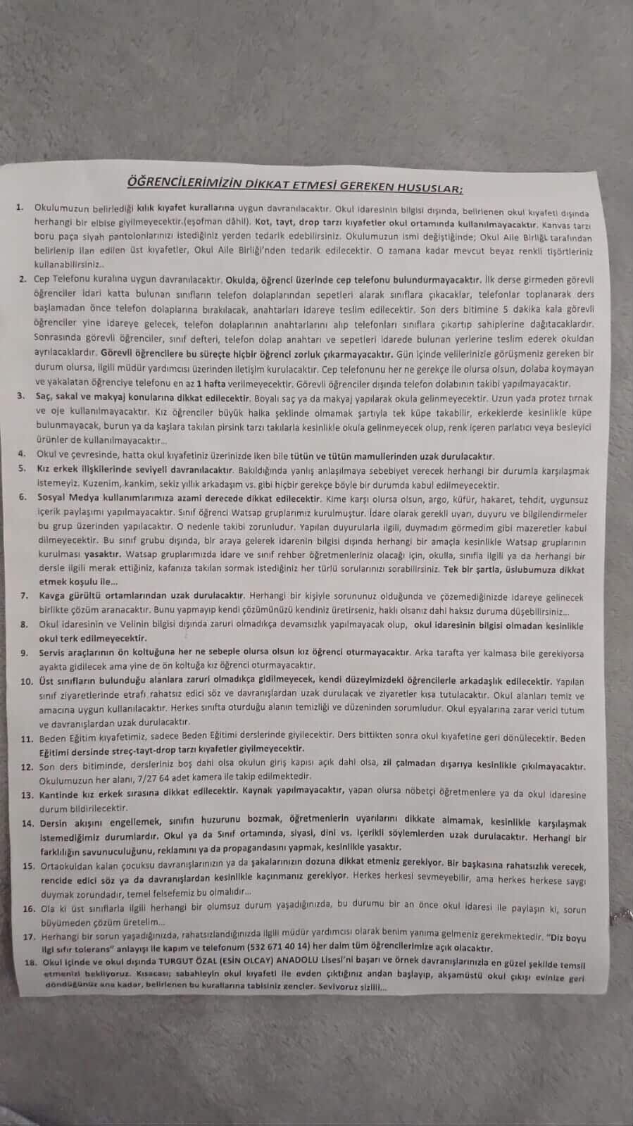 - Kıyafet düzeni: Kot, tayt ve drop tarzı kıyafetlerin okulda giyilmesi yasaklandı. Bu kural, öğrencilerin daha resmi ve eğitim odaklı bir görünüm sergilemelerini sağlamak için getirildi.