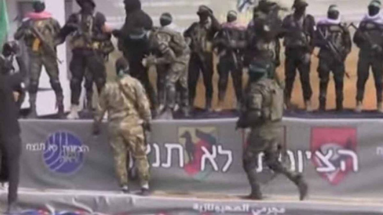 Esir takası anlaşmasının ilk aşamasının ikinci grubunun teslimi için hazırlıklar sürerken, dikkat çekici sembolik mesajlar verildi. Direnişçiler, İsrail liderlerinin fotoğraflarını ayaklarının altına sererken, platforma tüm işgal ordusu birliklerinin amblemlerini içeren ve üzerinde “Siyonizm kazanamayacak” yazılı bir sembol yerleştirdi.