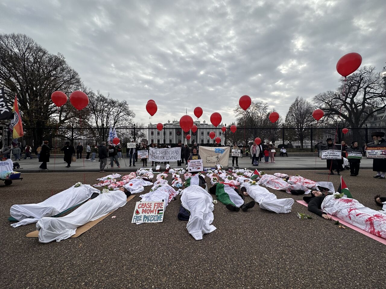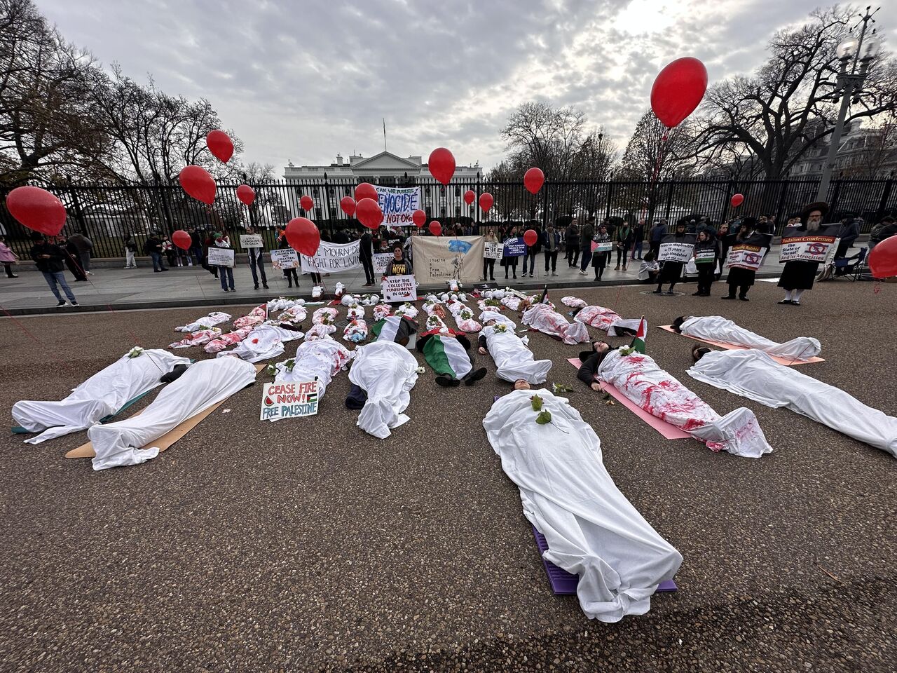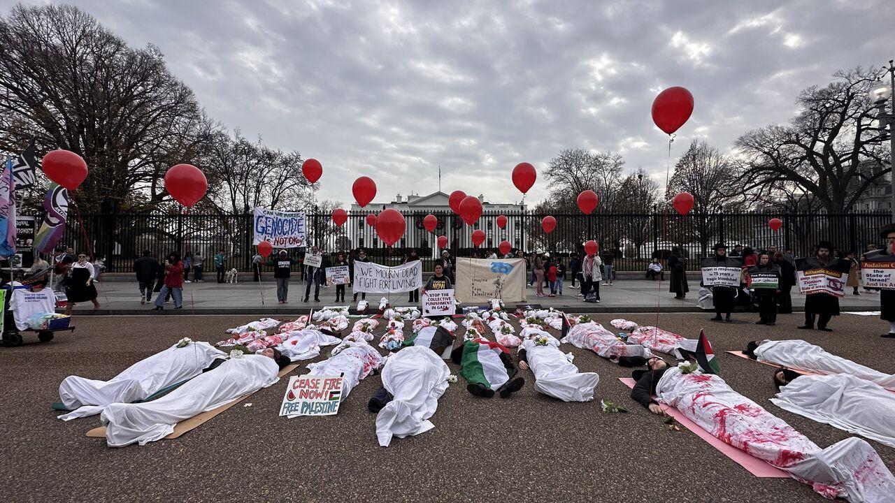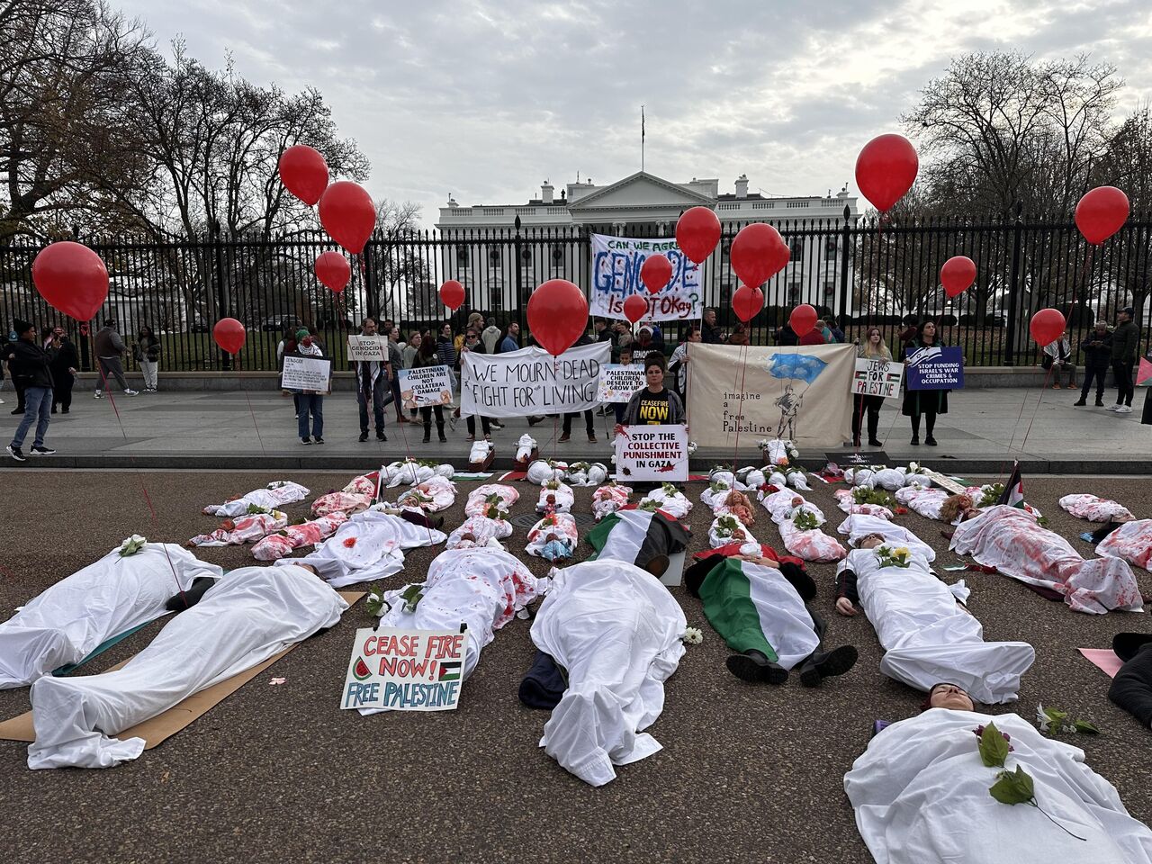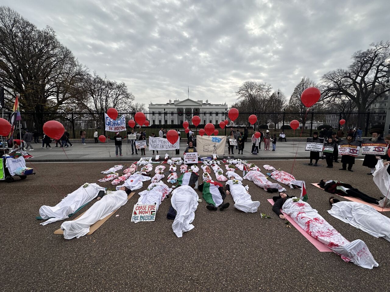 ABD'nin başkenti Washington'da, Beyaz Saray’ın önünde bir araya gelen aktivistler, Filistin'le dayanışmalarını ifade etmek için "Ölüm" temalı protesto gösterisi düzenledi.