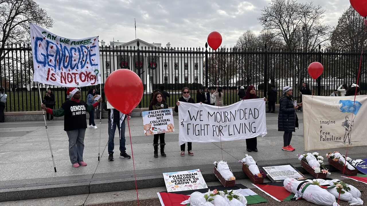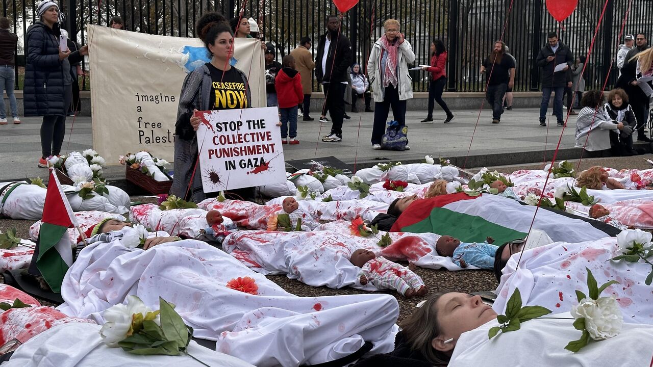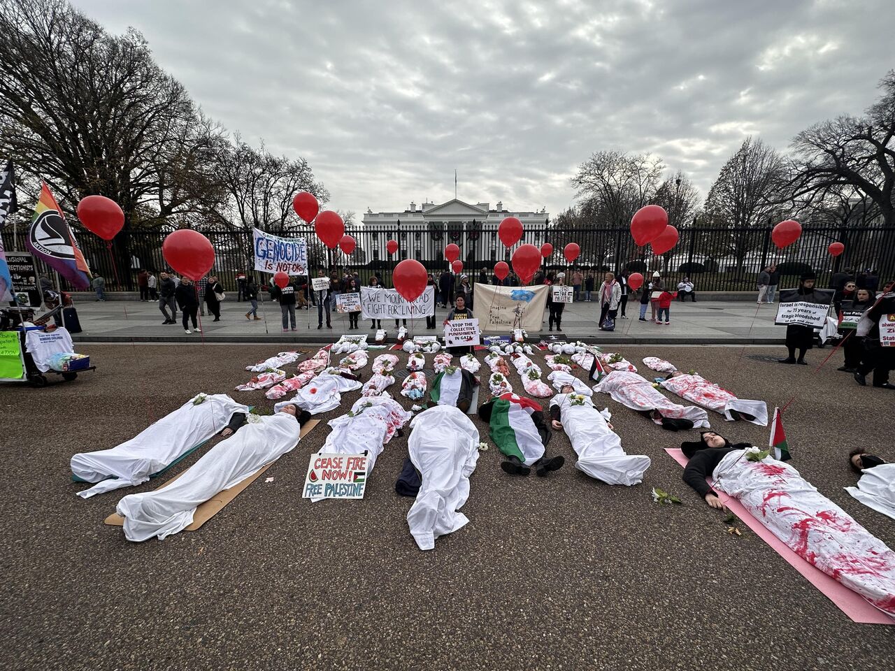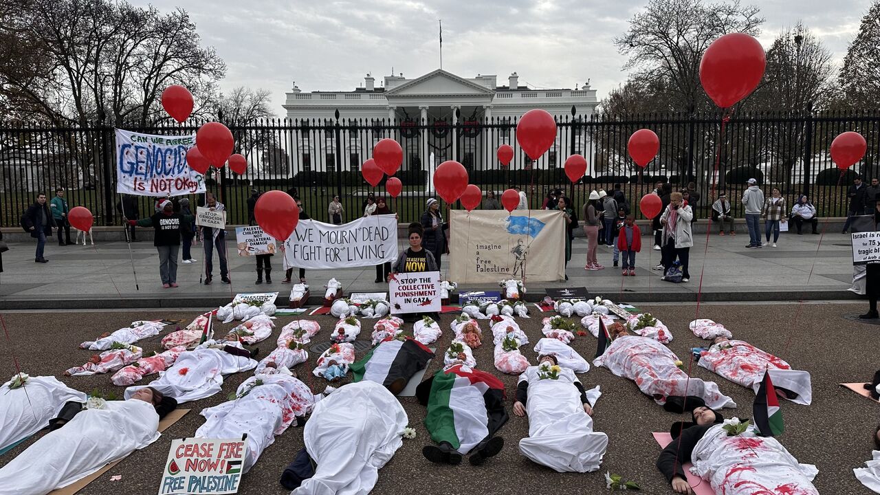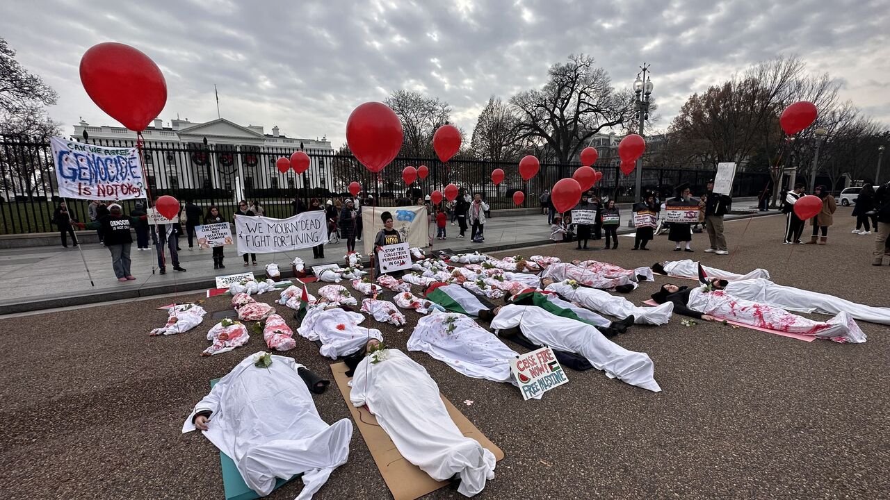 ABD'nin başkenti Washington'da, Beyaz Saray’ın önünde bir araya gelen aktivistler, Filistin'le dayanışmalarını ifade etmek için "Ölüm" temalı protesto gösterisi düzenledi.