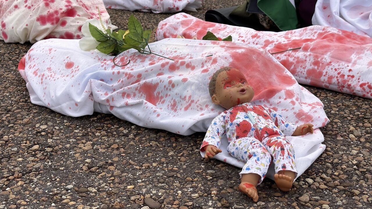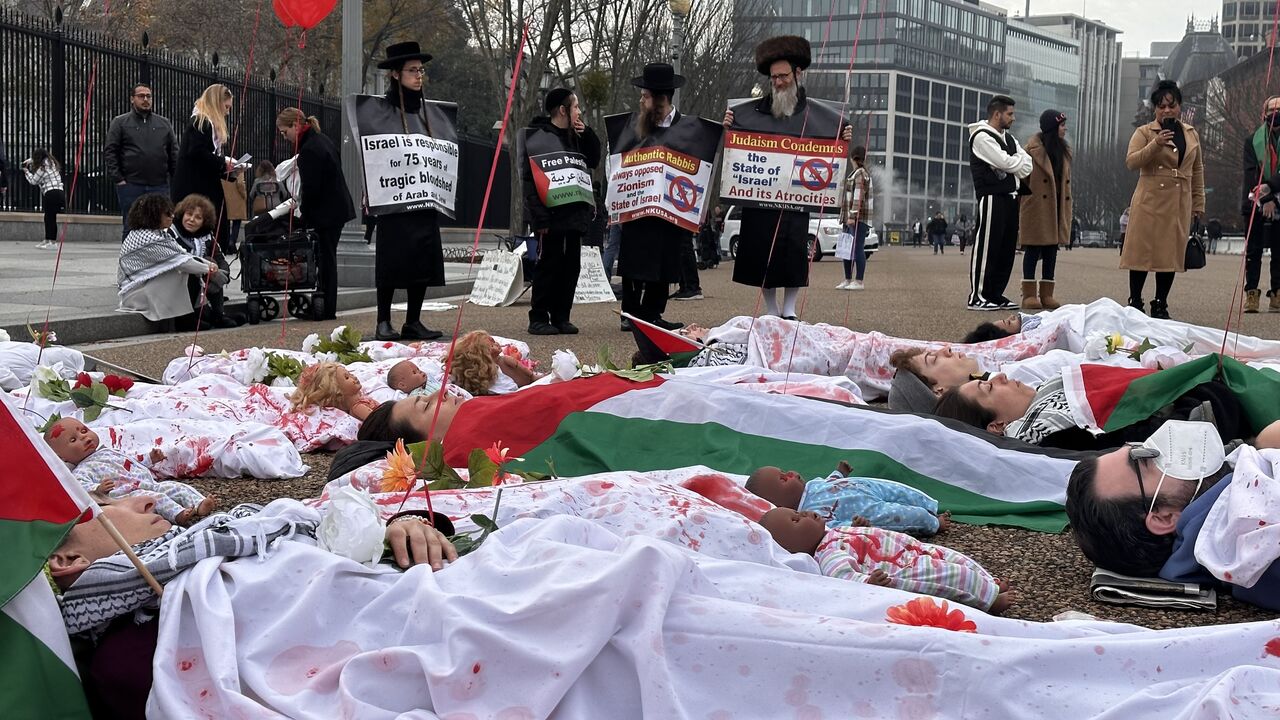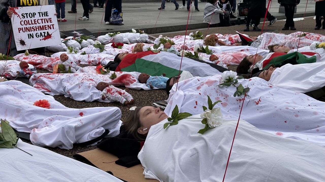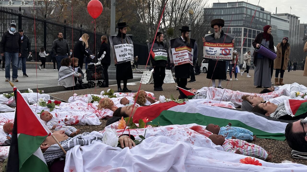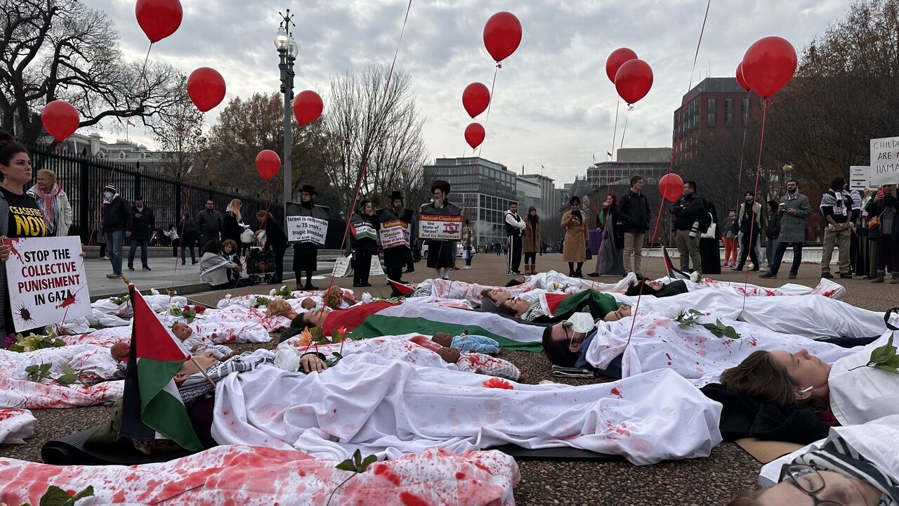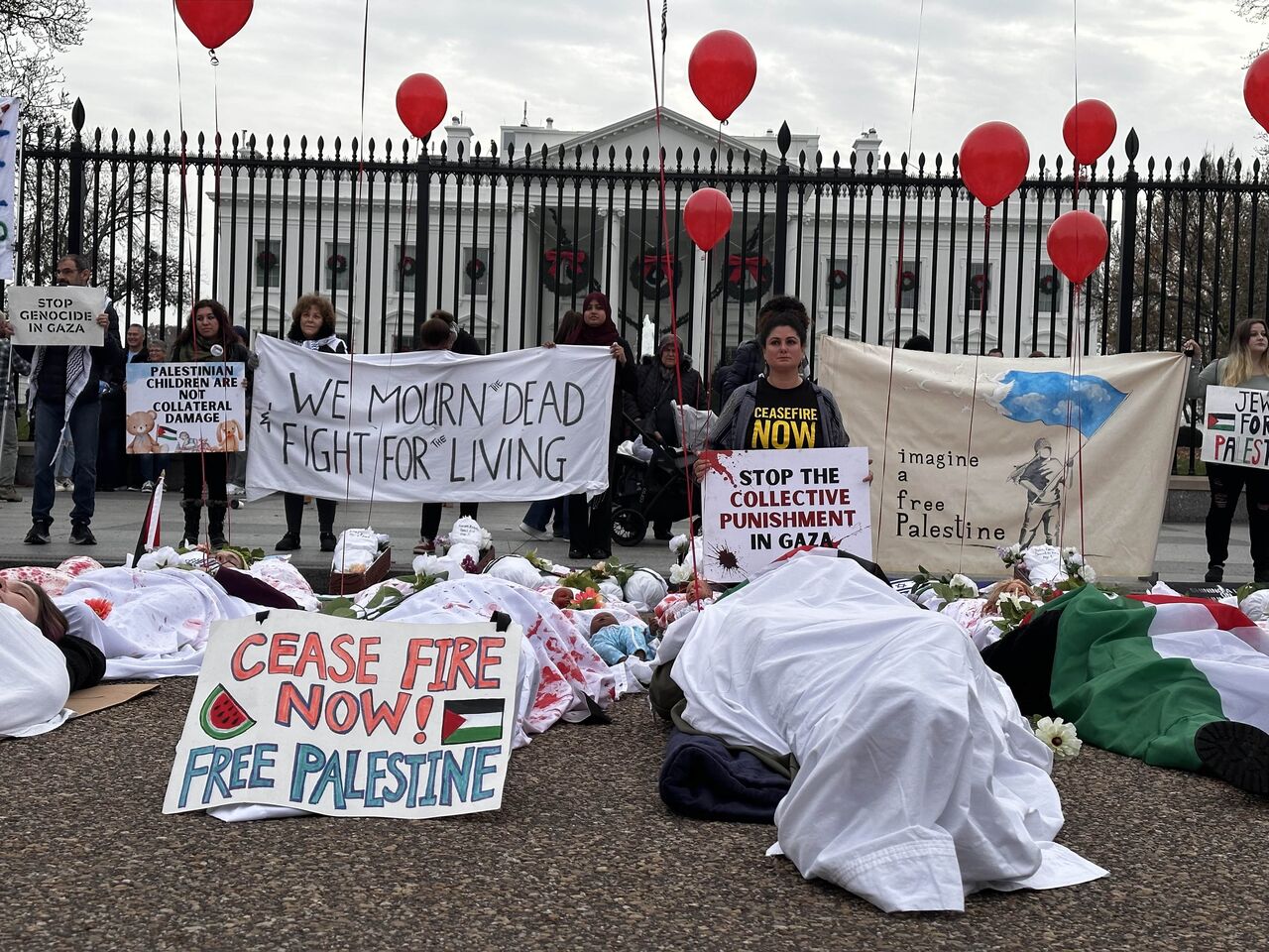 ABD'nin başkenti Washington'da, Beyaz Saray’ın önünde bir araya gelen aktivistler, Filistin'le dayanışmalarını ifade etmek için "Ölüm" temalı protesto gösterisi düzenledi.