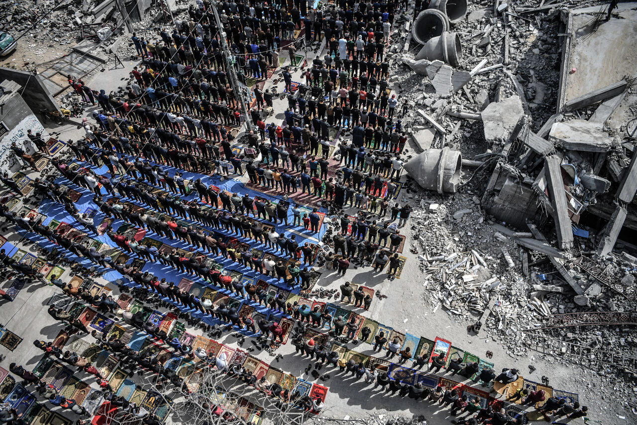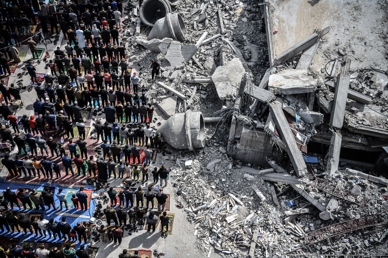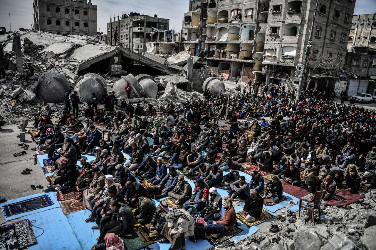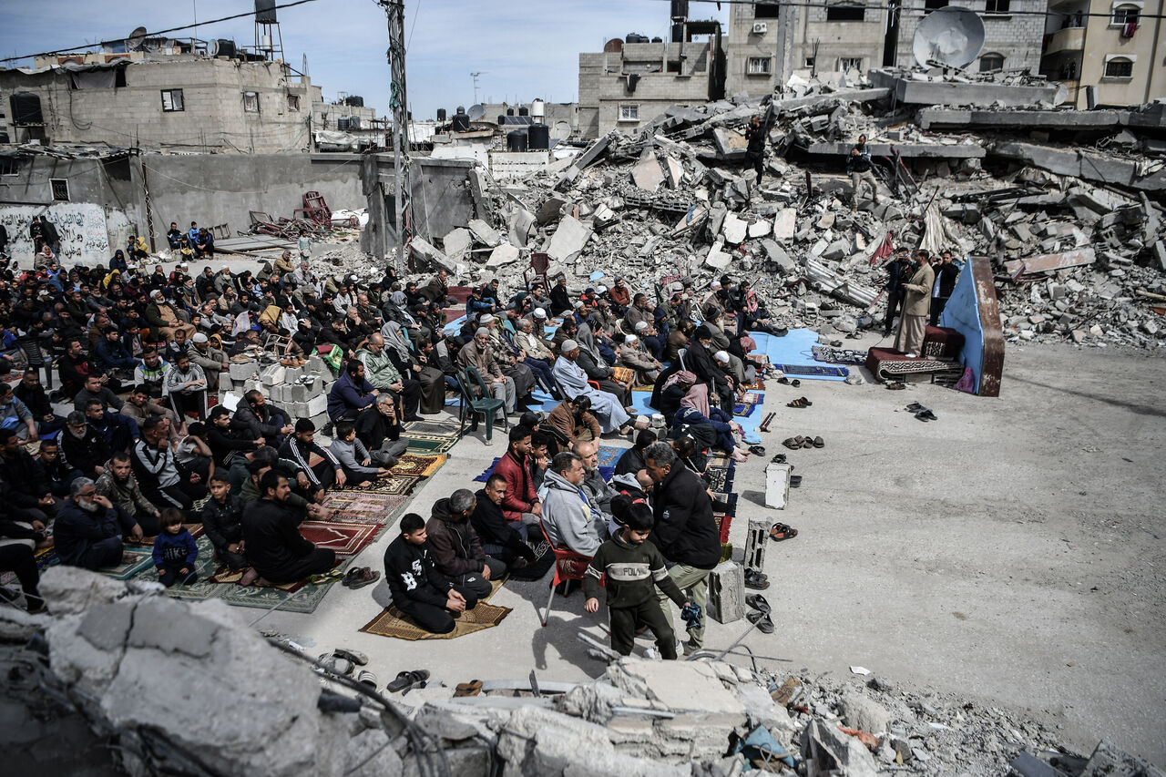 Gazze'nin Refah kentindeki Filistinliler, cuma namazını İsrail saldırısında yıkılan Faruk Camisi enkazında kıldı