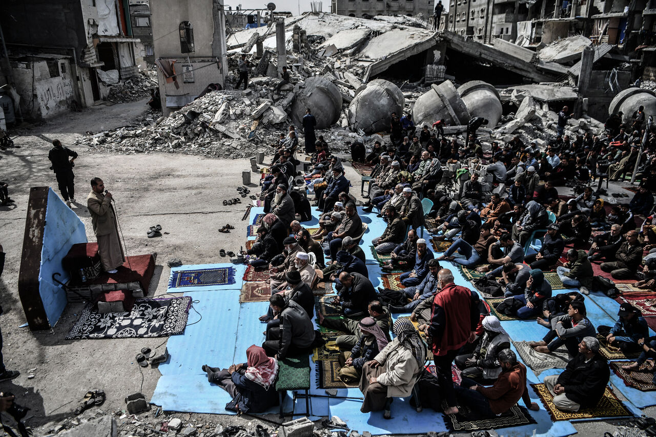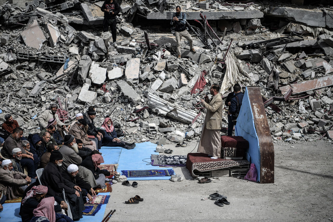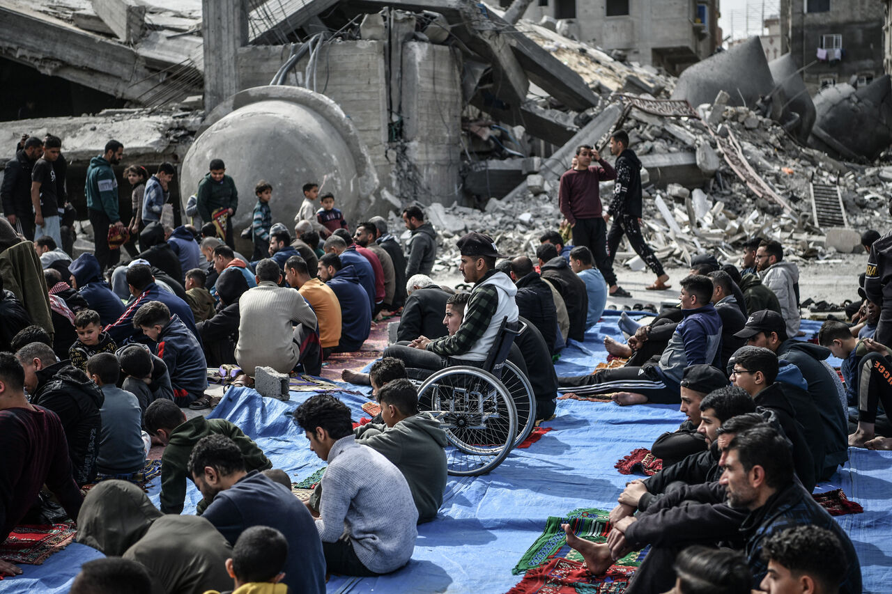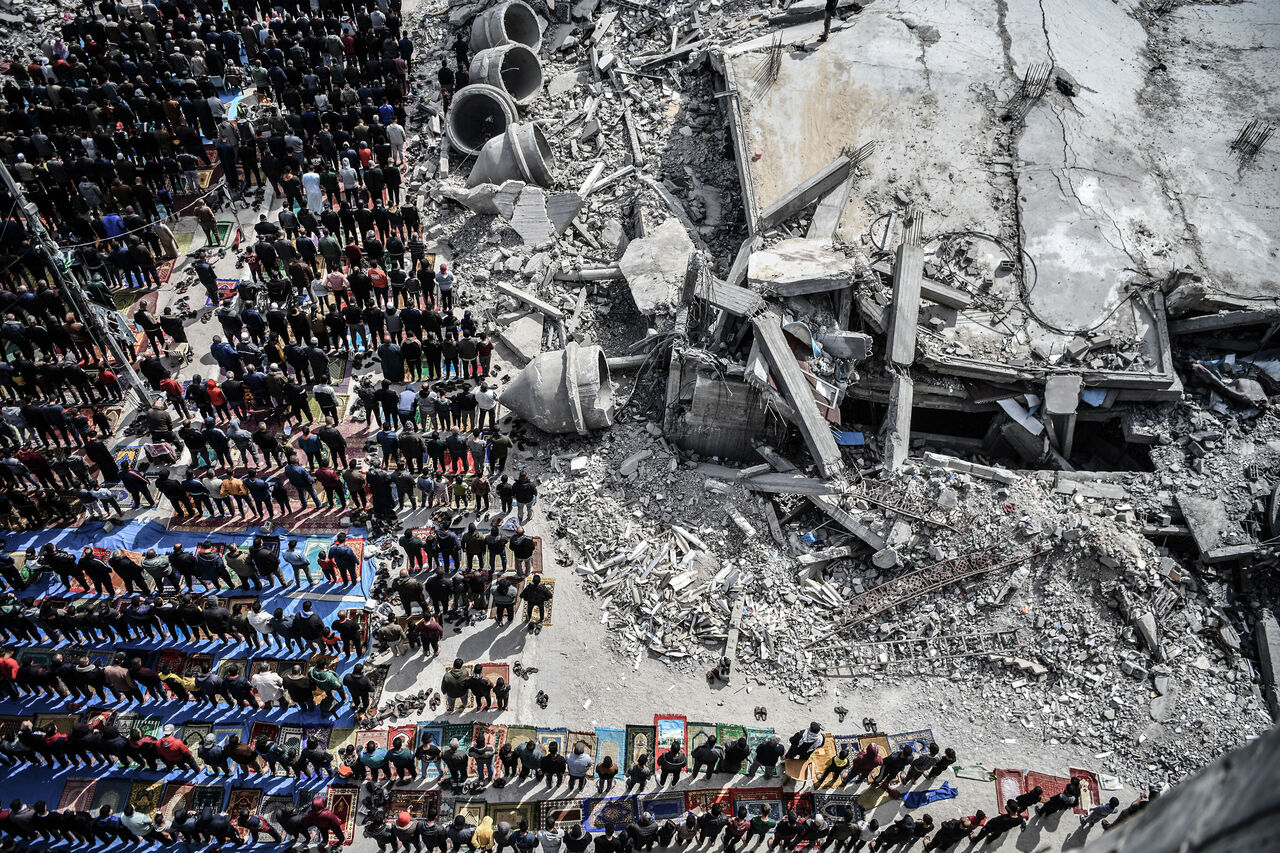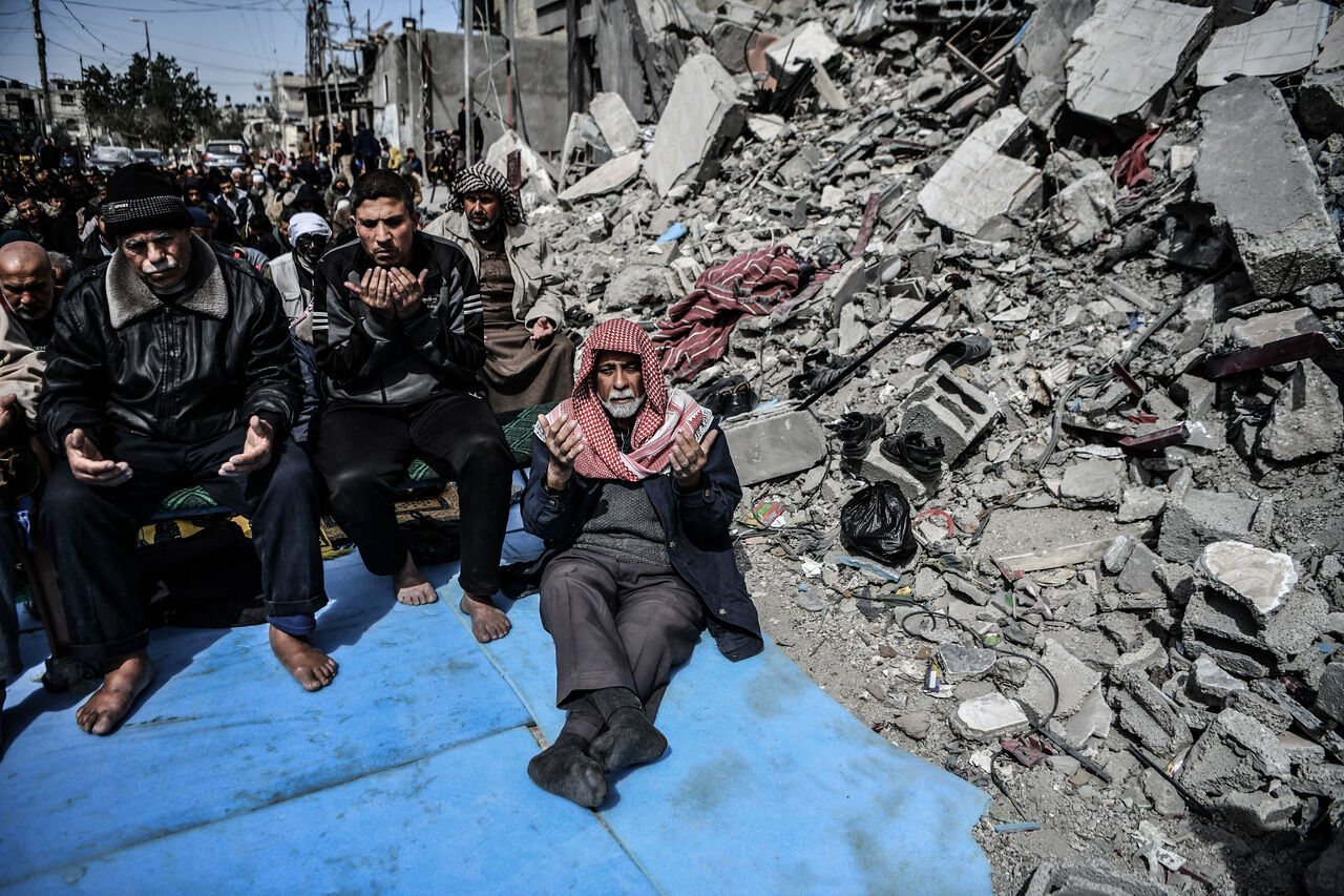 Gazze'nin Refah kentindeki Filistinliler, cuma namazını İsrail saldırısında yıkılan Faruk Camisi enkazında kıldı