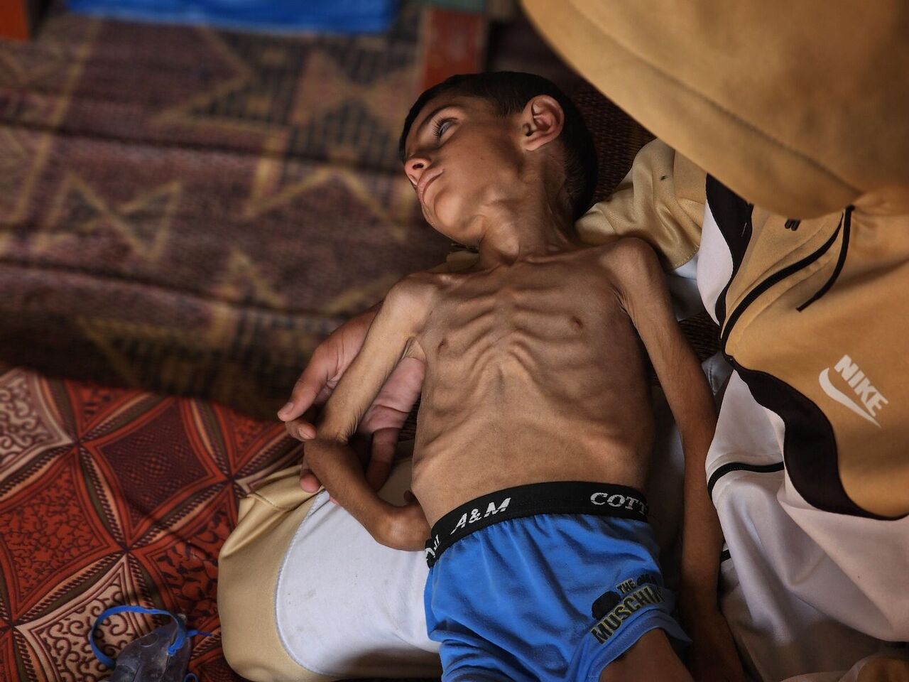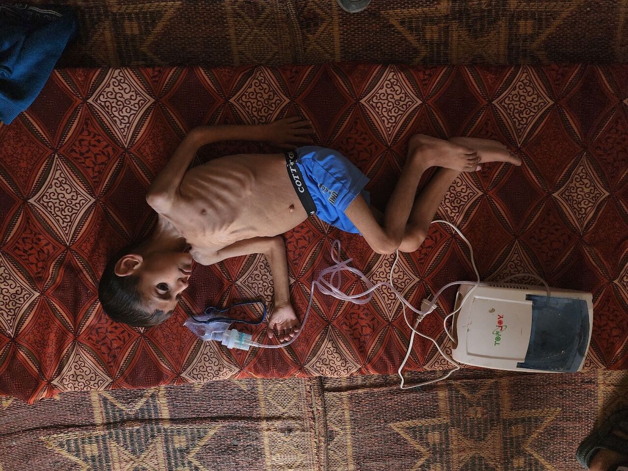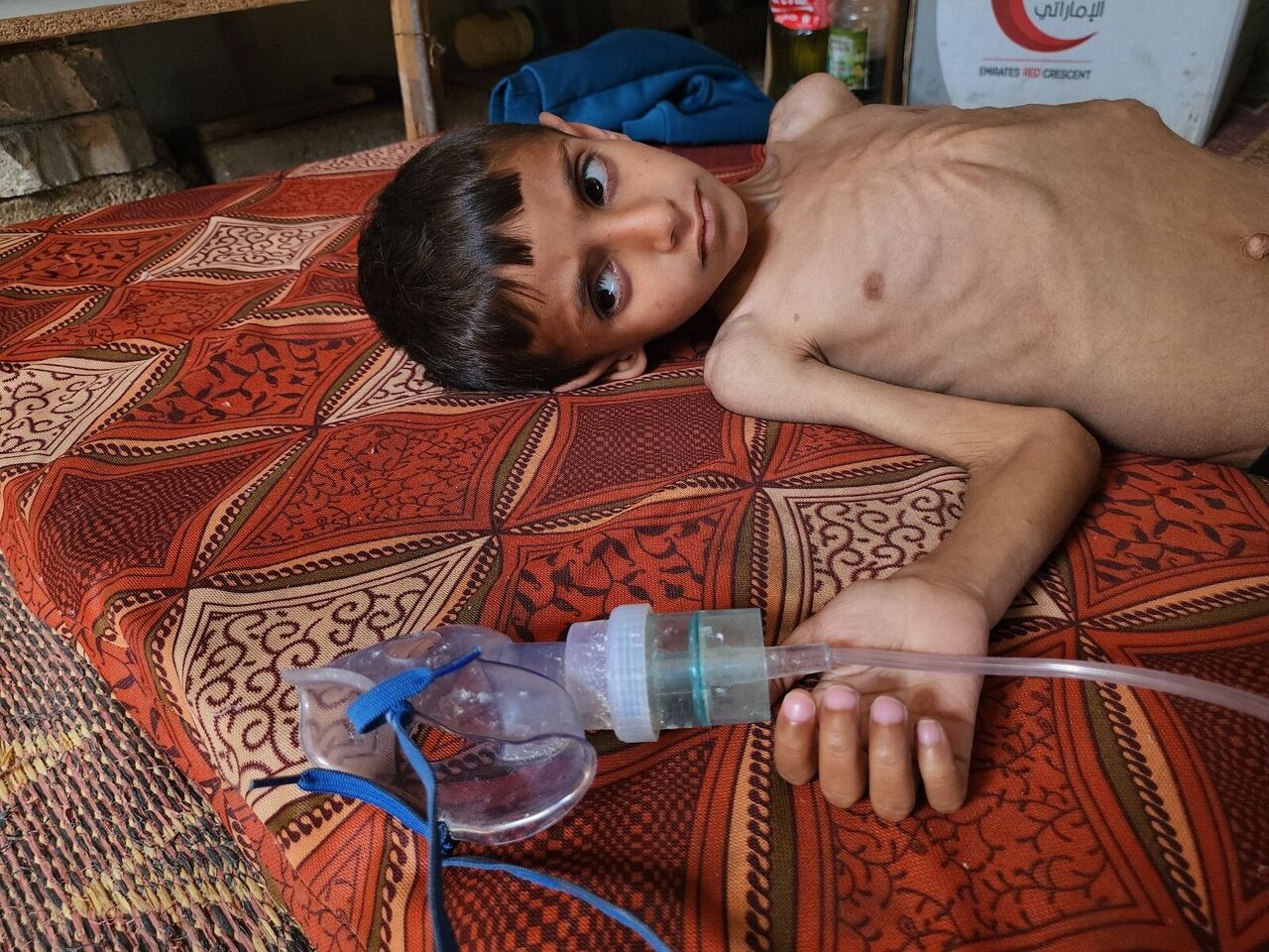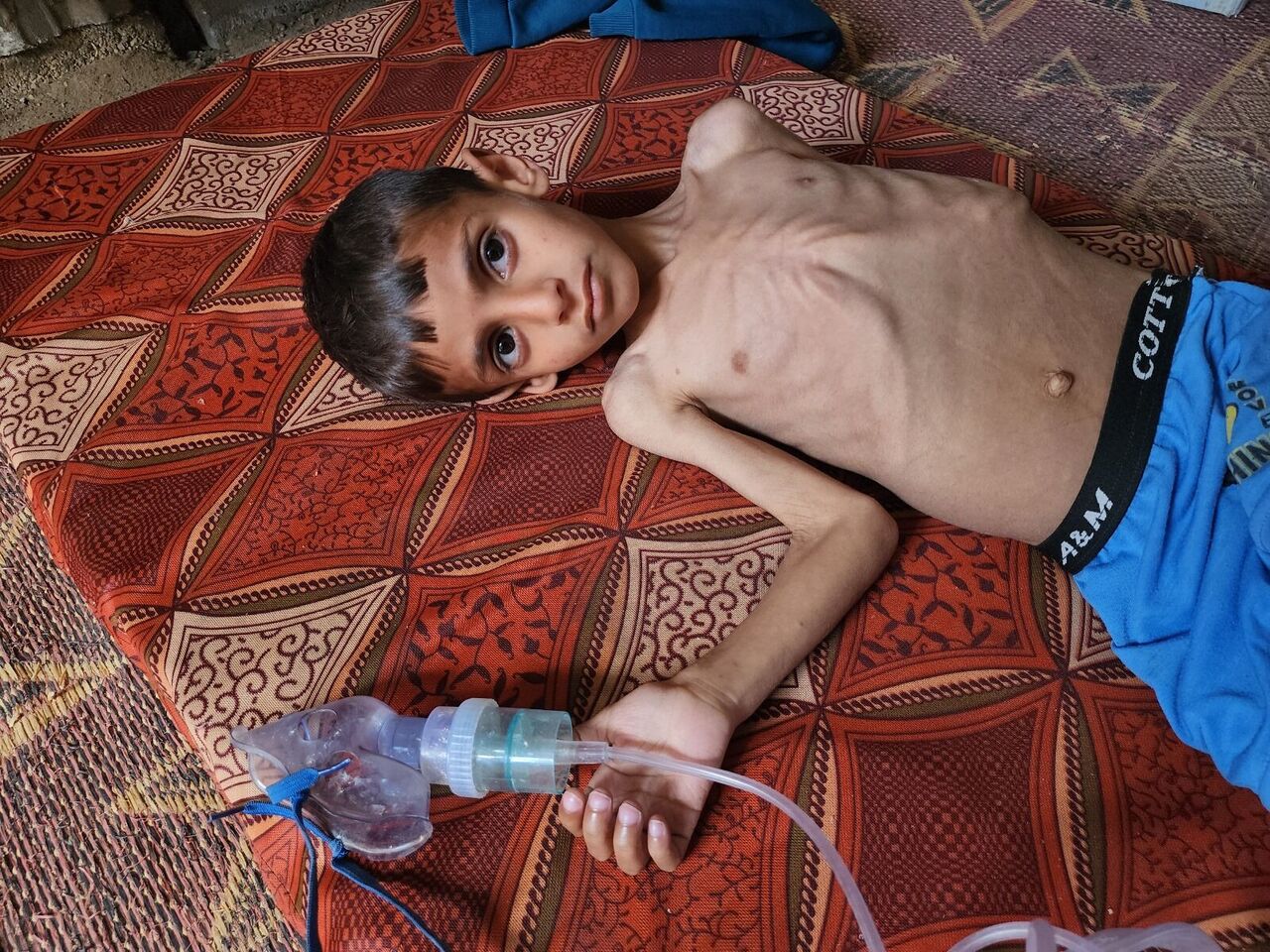 Osama Kamal El Rakab adli Filistinli çocuk, yetersiz beslenmeye bağlı vücut zayıflığı sorunlarıyla Gazze kentinin güneyinde yer alan Han Yunus kentinin doğusundaki Beni Suheyl beldesinde yaşam mücadelesi veriyor.