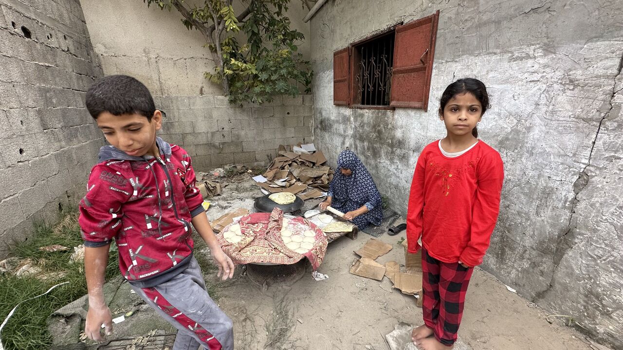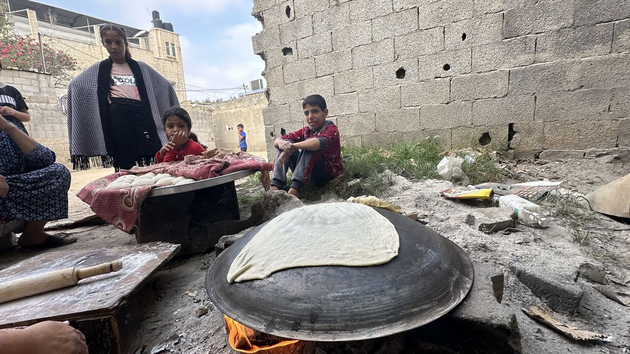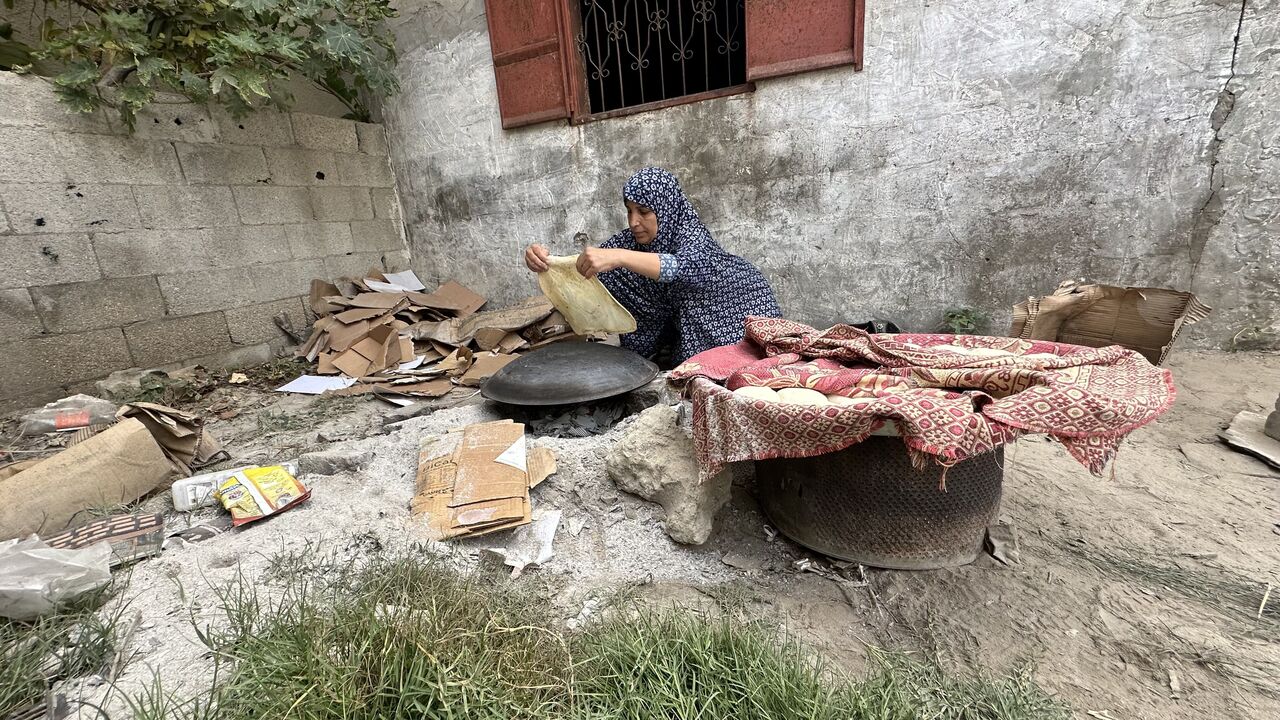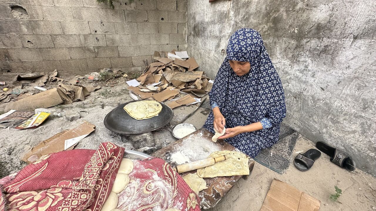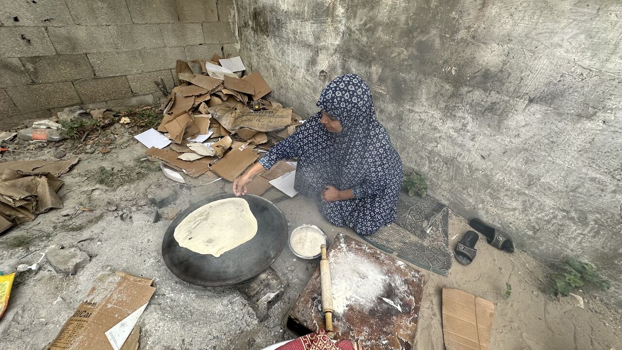 İsrail ordusunun düzenlediği saldırılardan korunmak üzere evinden çıkan Filistinli Ümmü Halid de Aksa Şehitleri Hastanesi'ne sığınanlardan. Ümmü Halid, sığındığı bölgede yaşamını sürdürmeye çalışırken çocukları için de sacda ekmek pişirerek günlük yiyecek ihtiyaçlarını karşılıyor.
