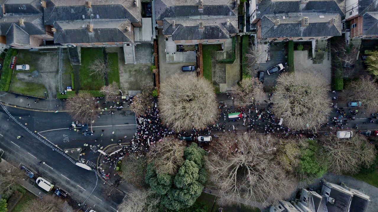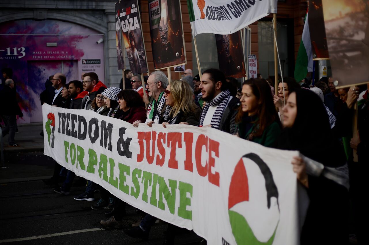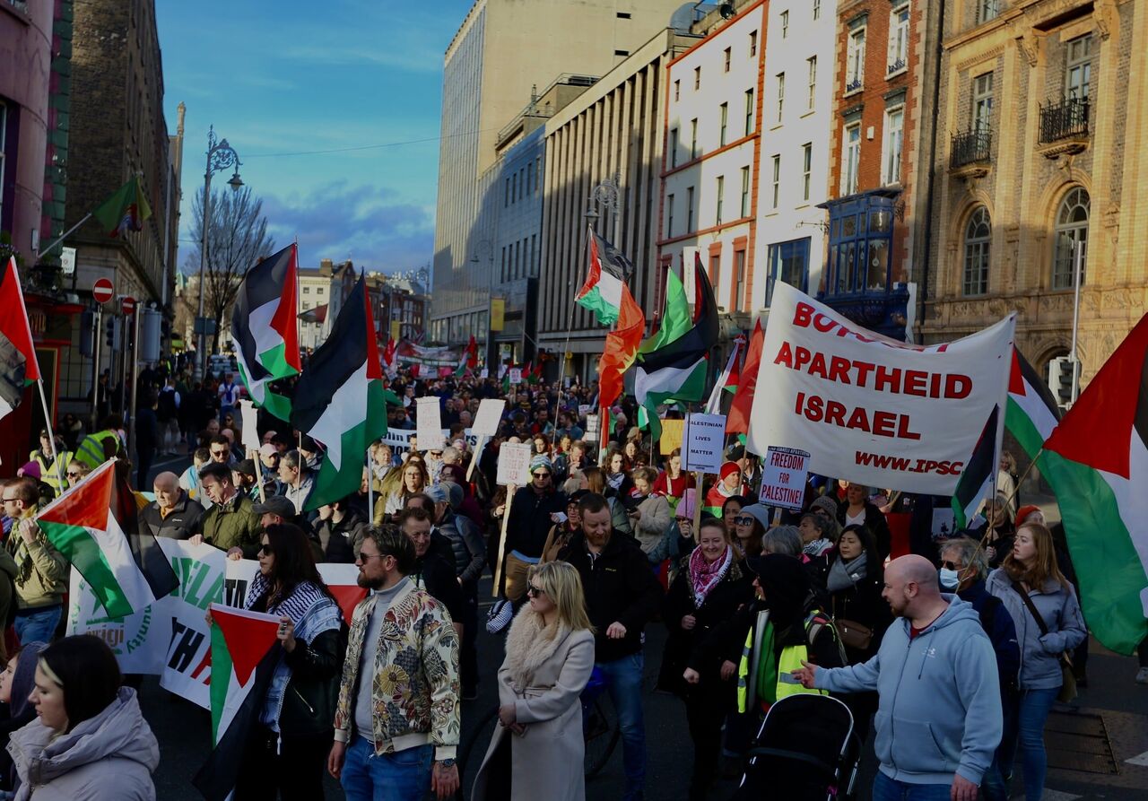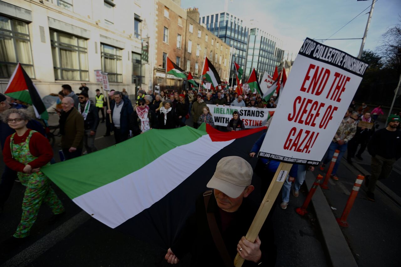 İrlanda'nın başkenti Dublin'de bir arayan gelen göstericiler, İsrail'in Gazze'ye yönelik saldırılarını protesto ederek Filistinliler için destek gösterisi düzenledi. Kent merkezinden ABD büyükelçilik binasına yürüyüş düzenleyen göstericiler ateşkes çağrısında bulundu.