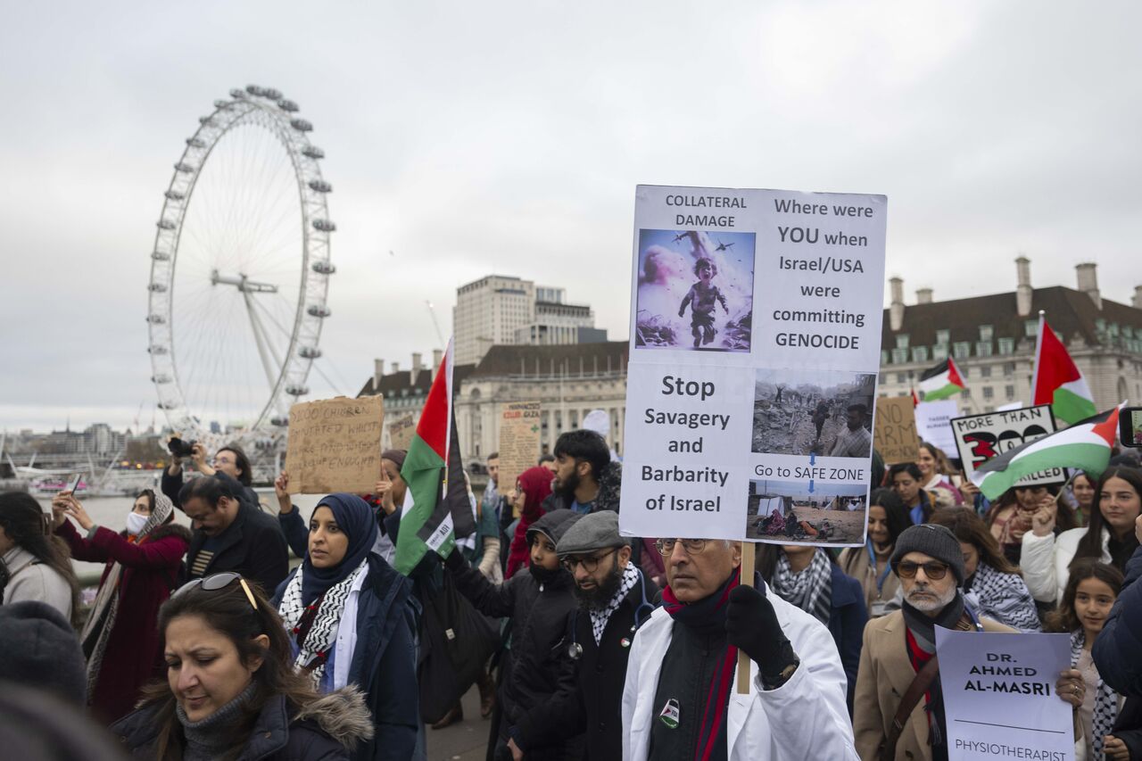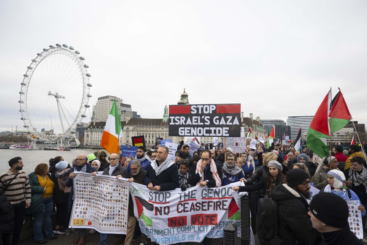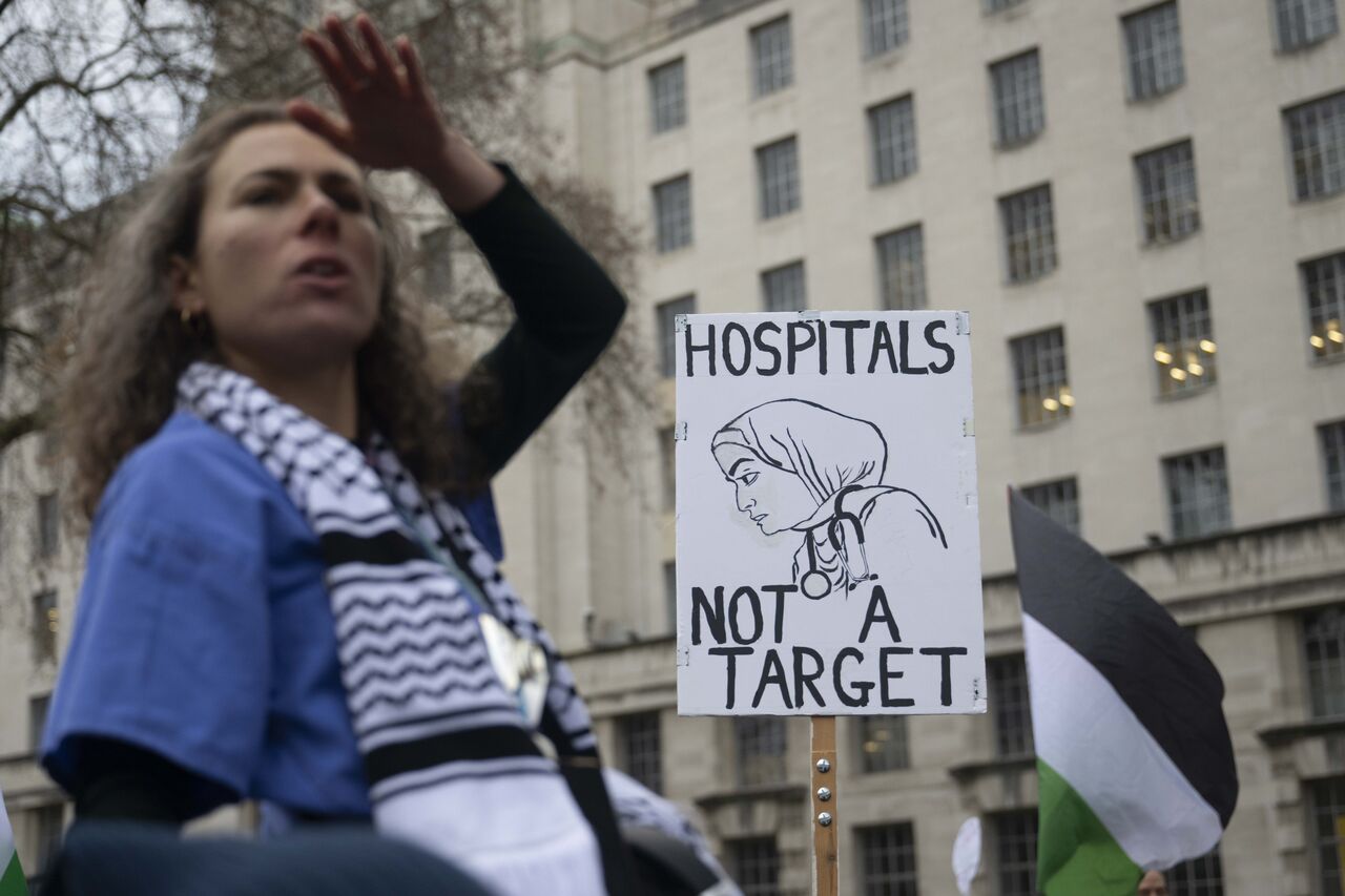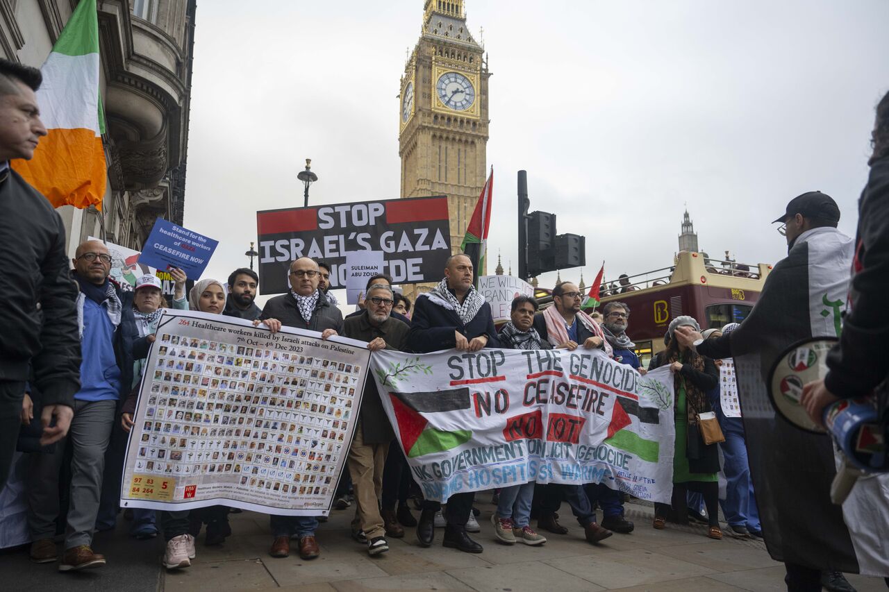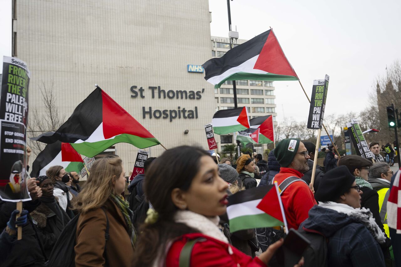 St. Thomas Hastanesi önünde toplanan göstericiler Başbakanlığın önüne yürüyerek Gazze'de acil ateşkes çağrısında bulundu. Sağlık çalışanlarının üniformalarıyla katıldıkları eylemde, İsrail'in Gazze'deki saldırılarında öldürülen meslektaşlarının isimlerinin ve unvanlarının yazılı olduğu pankartları taşıdı.