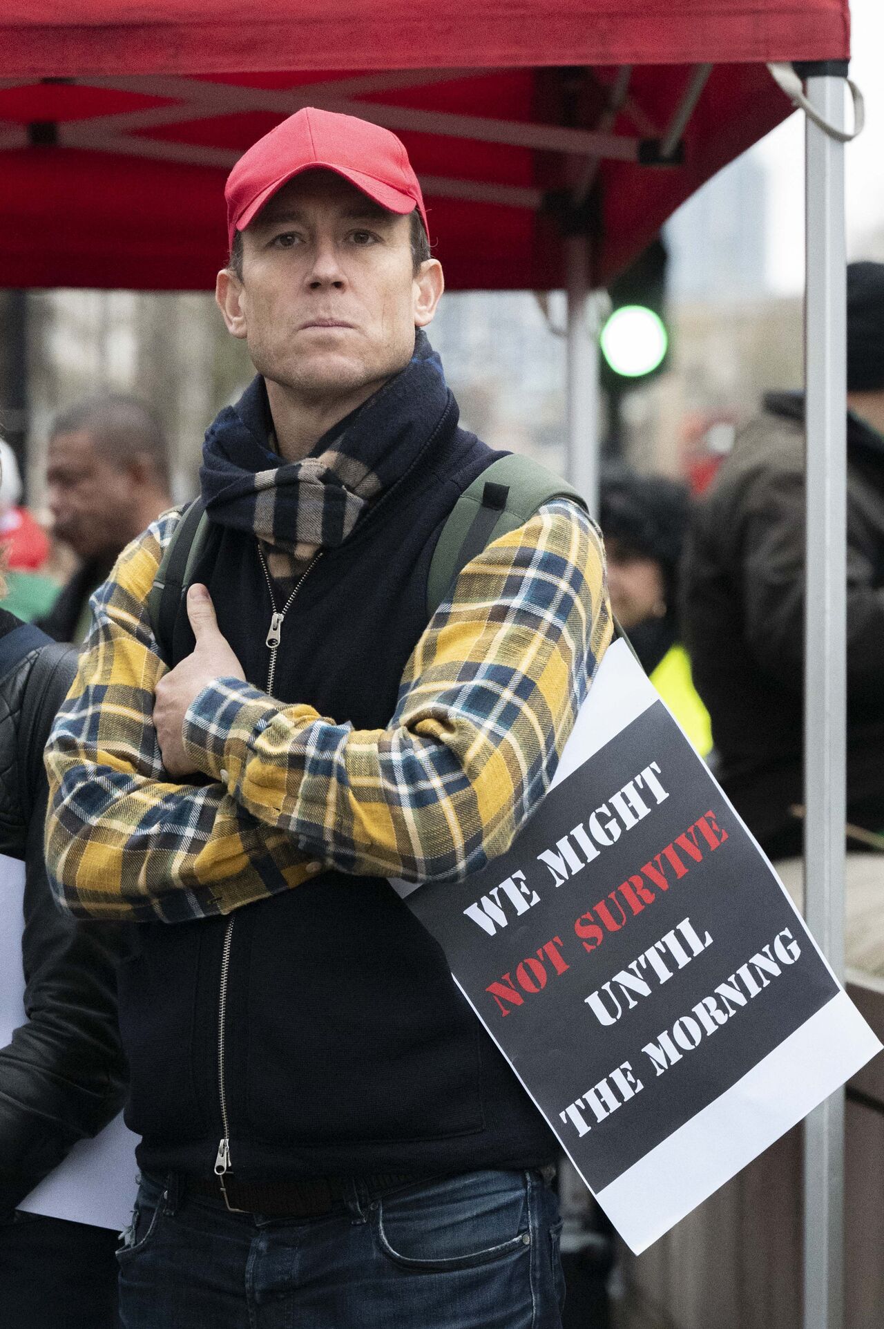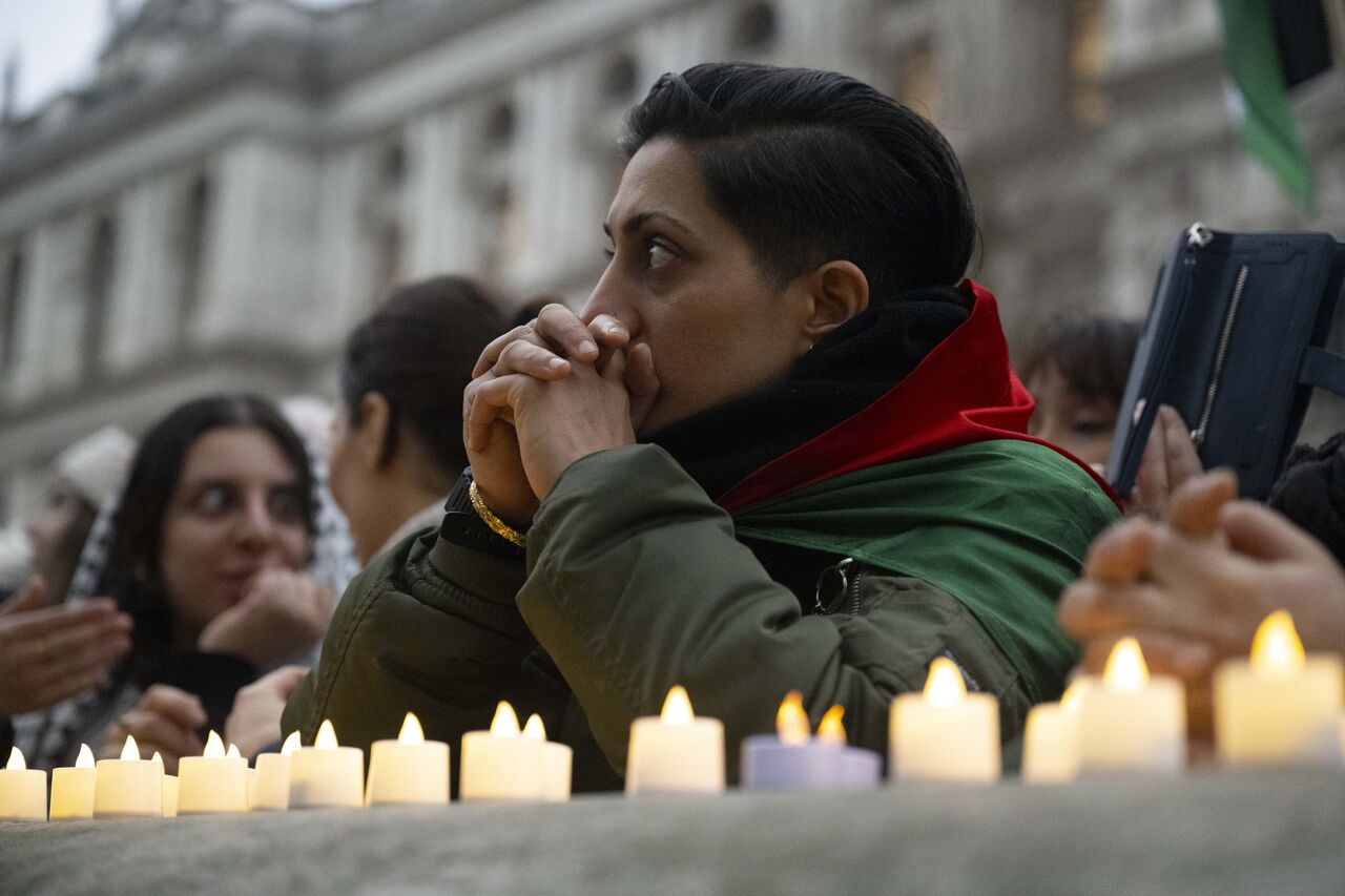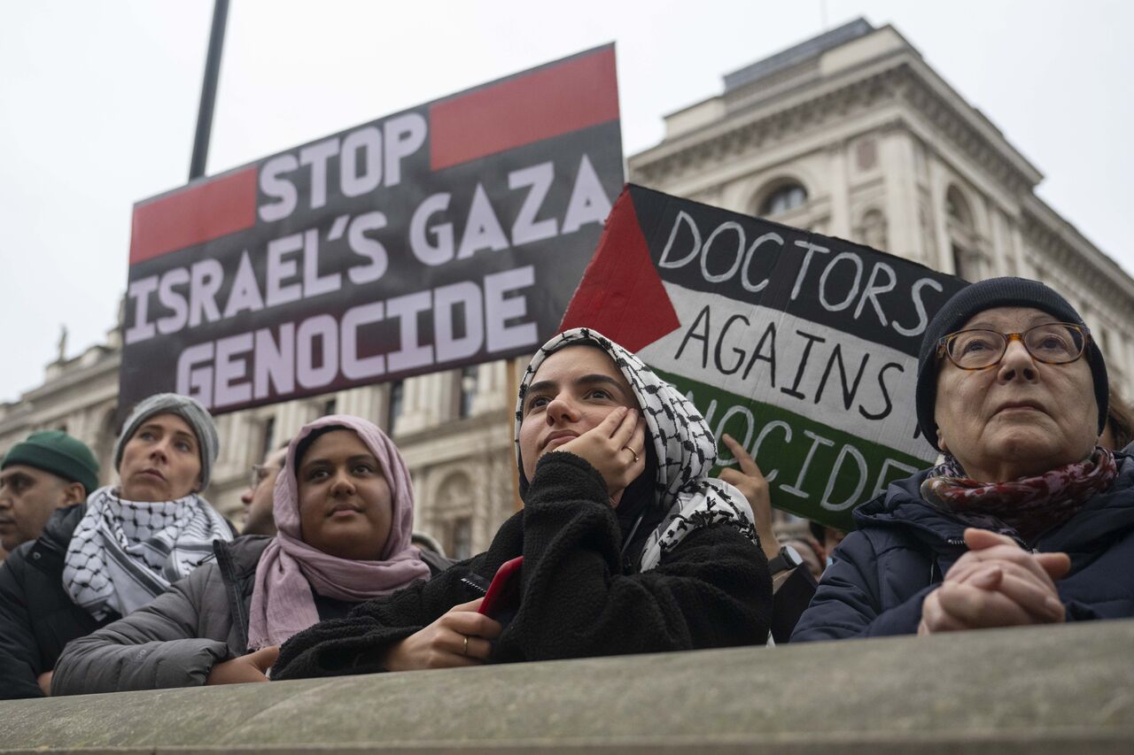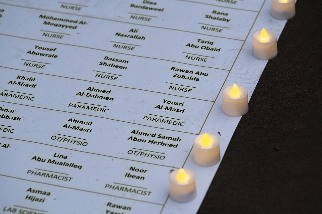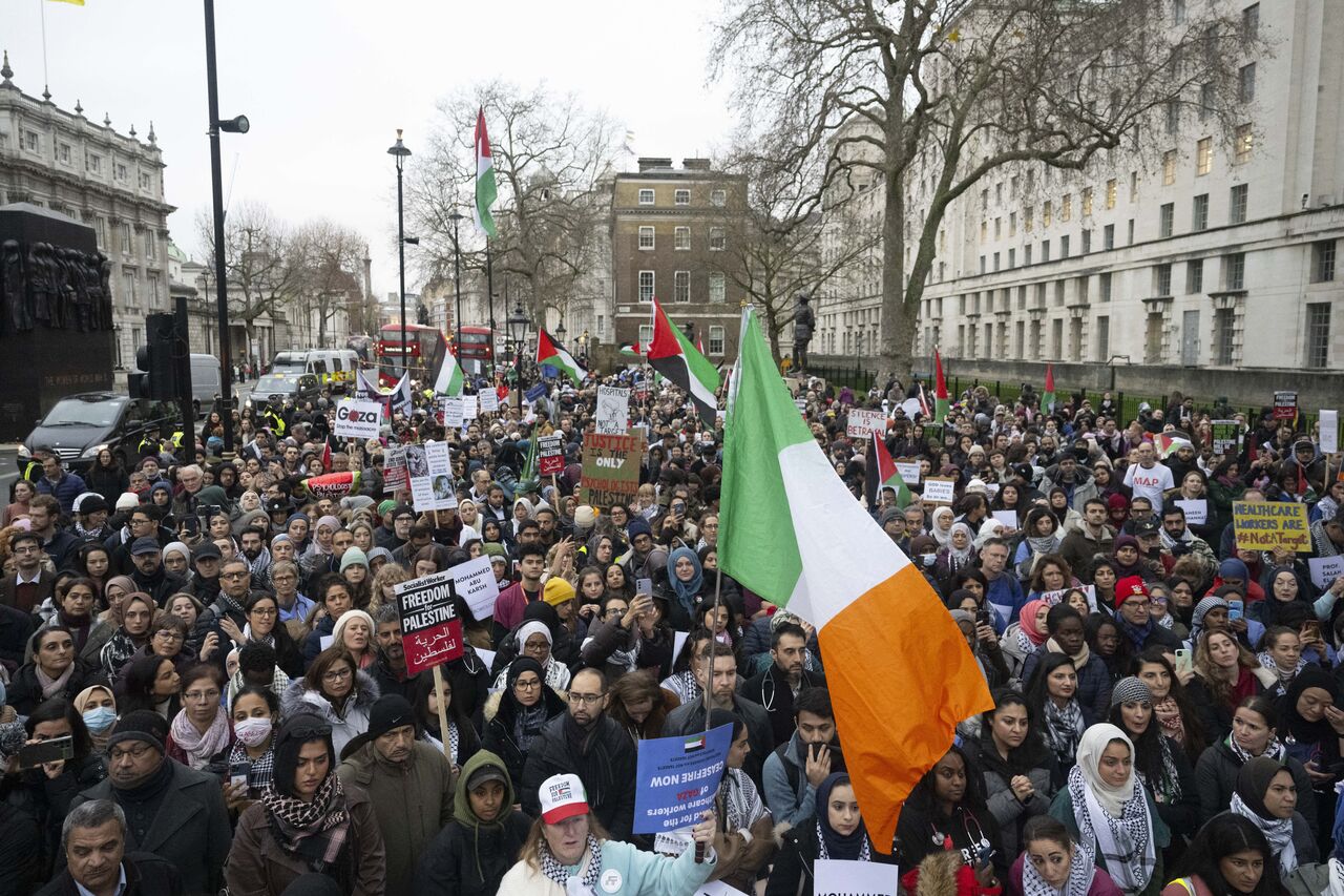 St. Thomas Hastanesi önünde toplanan göstericiler Başbakanlığın önüne yürüyerek Gazze'de acil ateşkes çağrısında bulundu. Sağlık çalışanlarının üniformalarıyla katıldıkları eylemde, İsrail'in Gazze'deki saldırılarında öldürülen meslektaşlarının isimlerinin ve unvanlarının yazılı olduğu pankartları taşıdı.