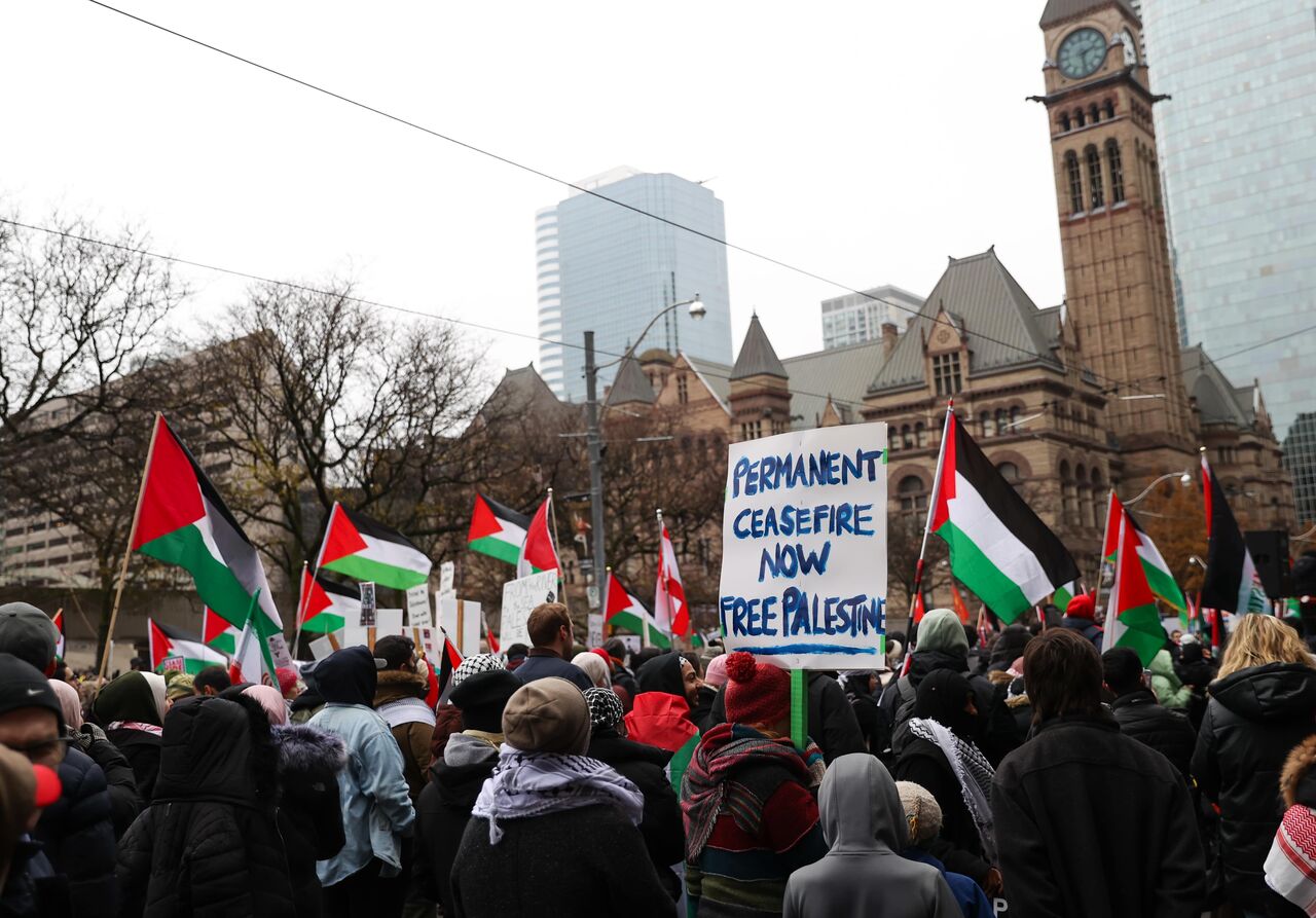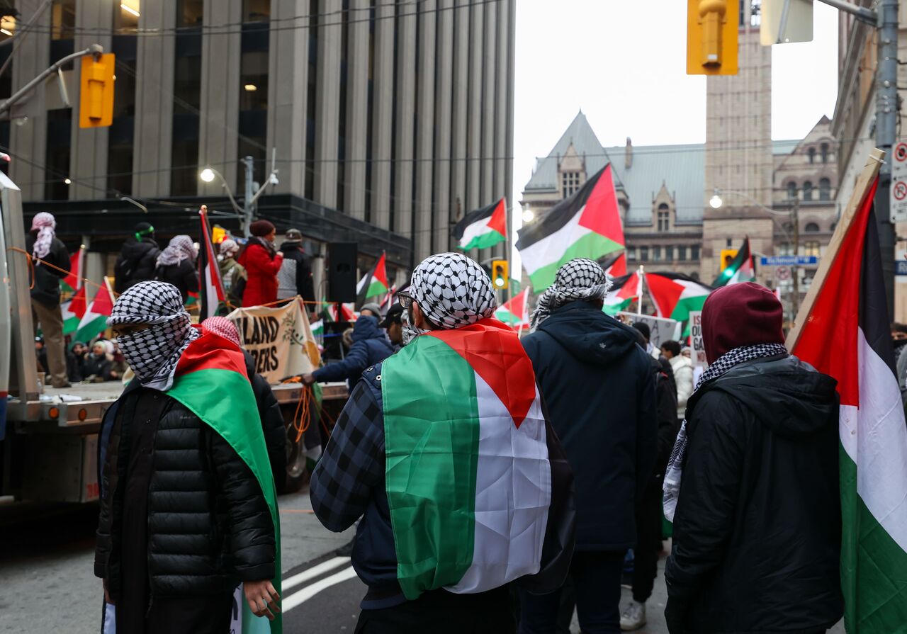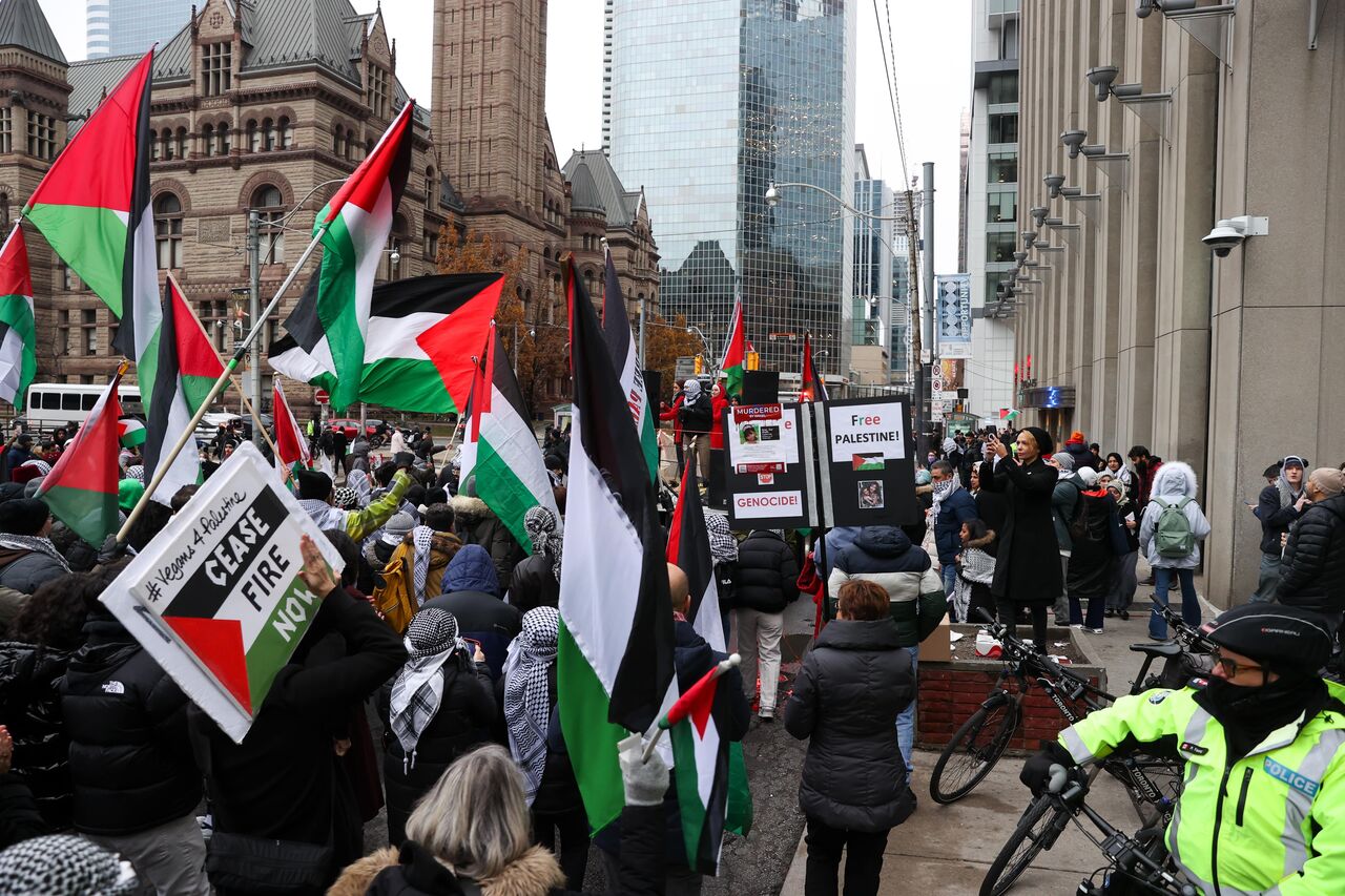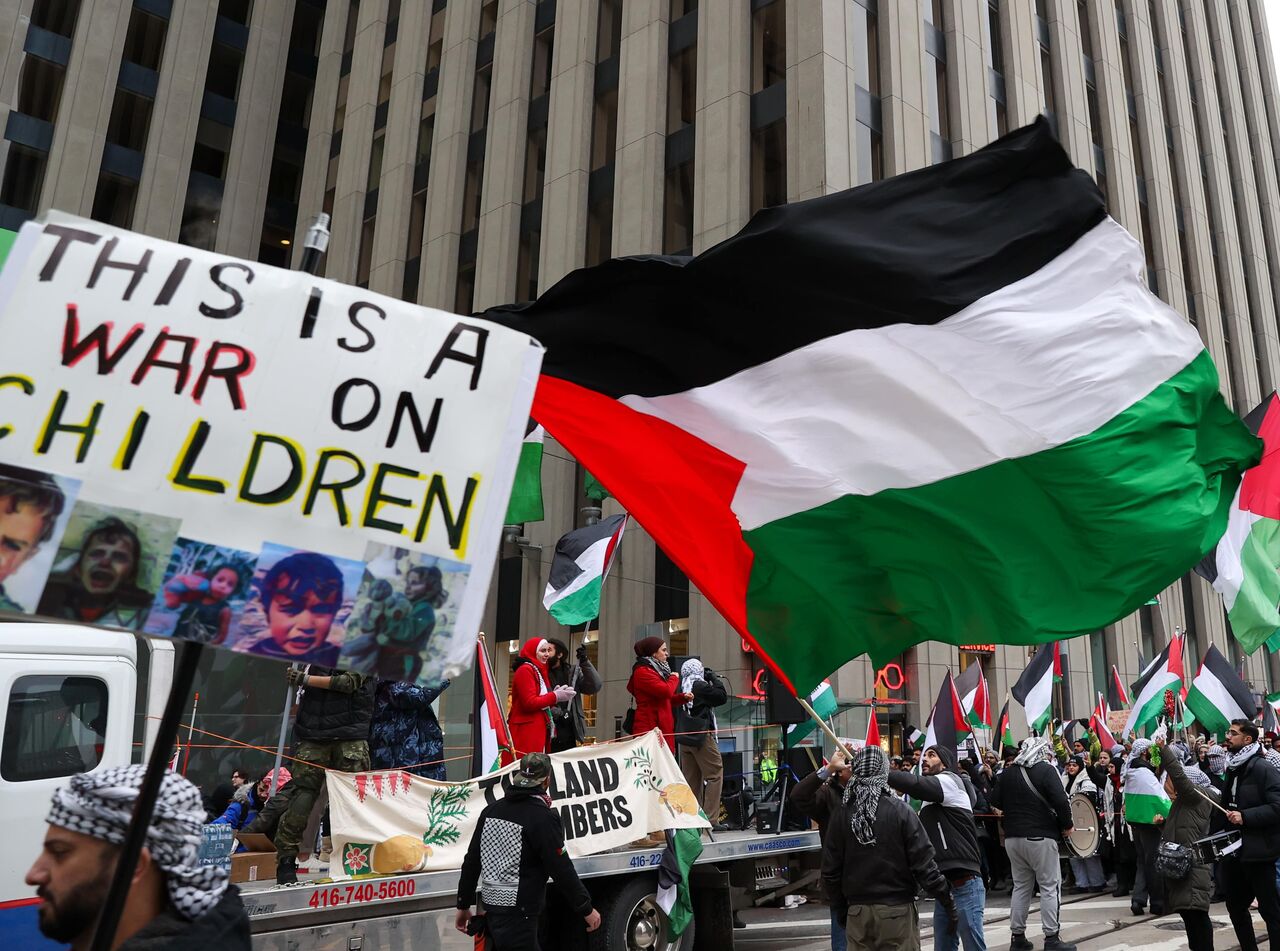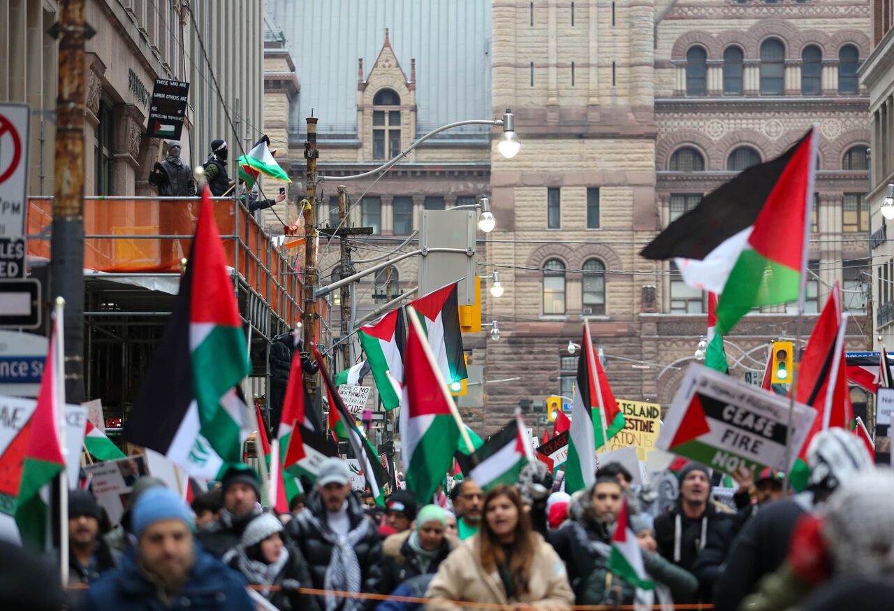 İsrail'in Gazze'ye yönelik saldırılarını protesto eden göstericiler, ellerinde pankart ve Filistin bayrakları taşıyarak Nathan Phillips Meydanı'ndan başlayarak, Toronto şehir merkezinde yürüdü.