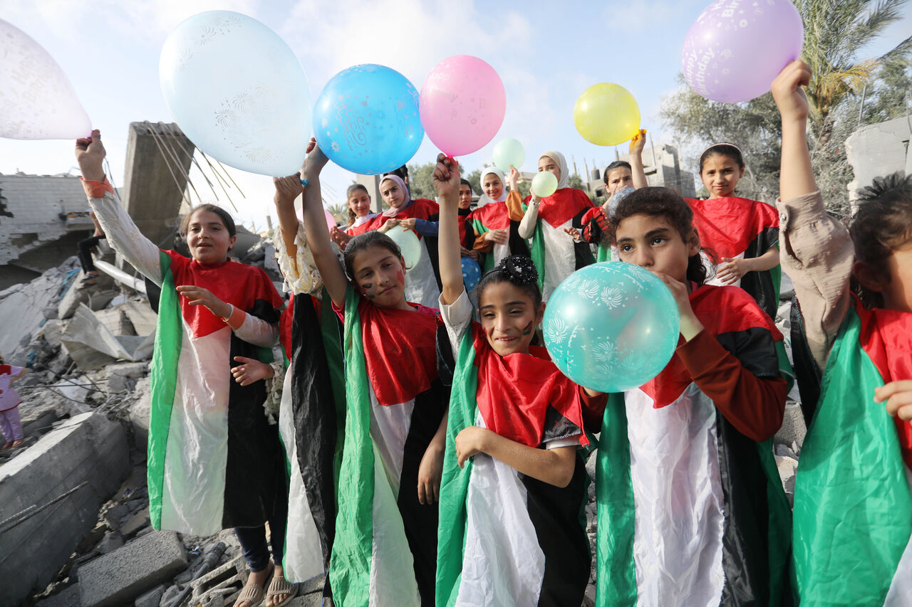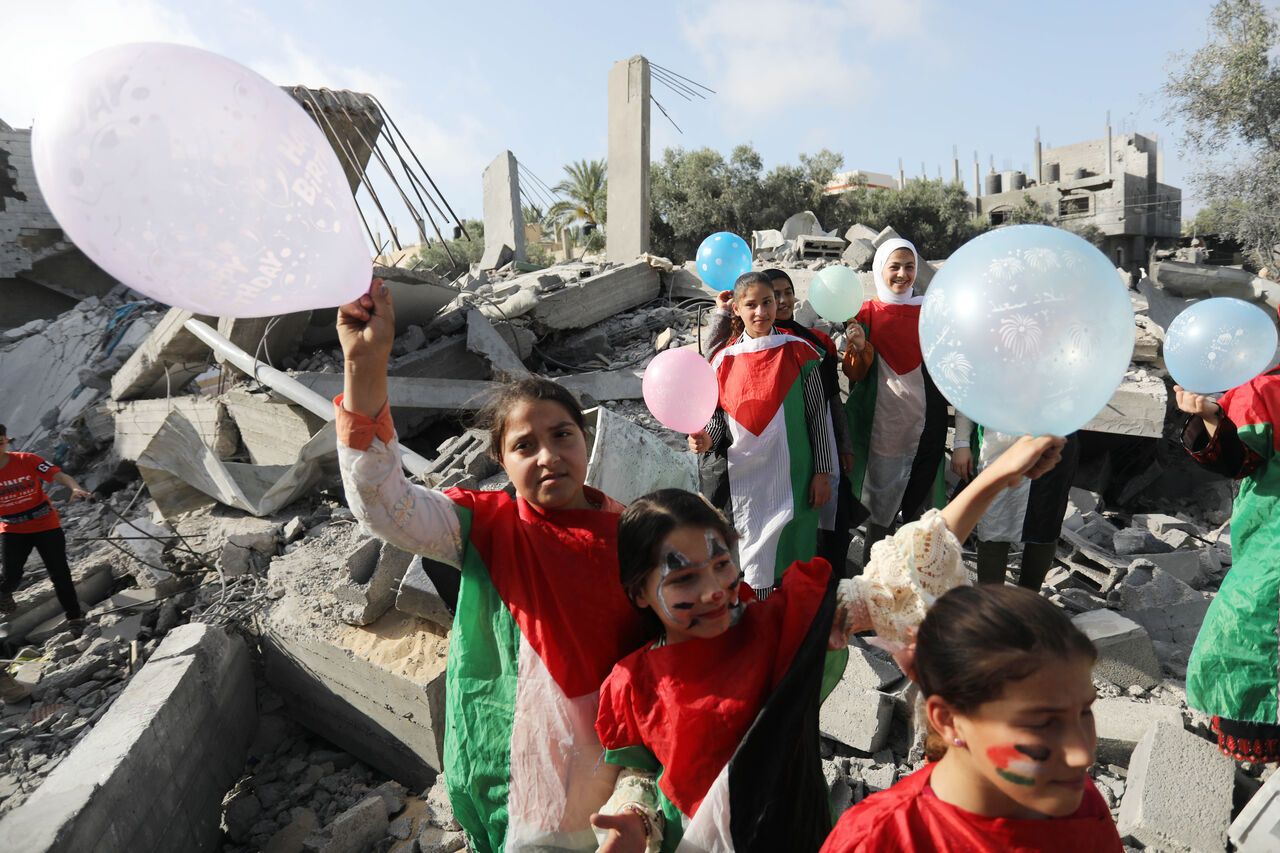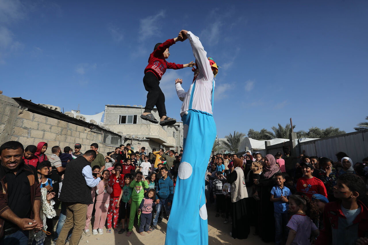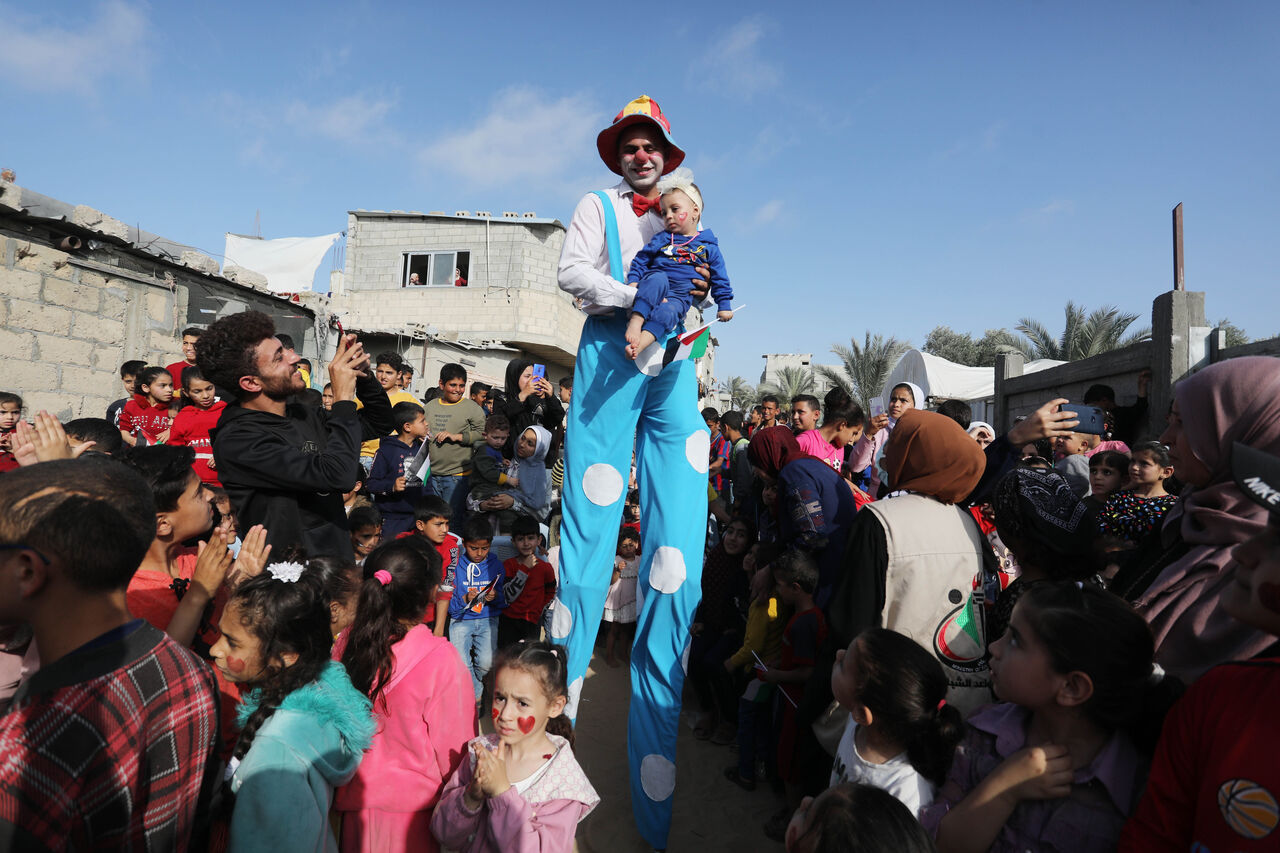 Filistinli gönüllü bir grup genç ve palyaçolar, Gazze Şeridi'nin Deyr Balah kentindeki çocukların yüzlerini güldürmek ve savaşın olumsuz izlerini bir nebze unutturmak için İsrail'in saldırıları sonuncu harabeye dönen bir binaların enkazı üzerinde eğlence etkinlikleri düzenledi. Gönüllü gençler, çocukların yüzünü güldürdü.