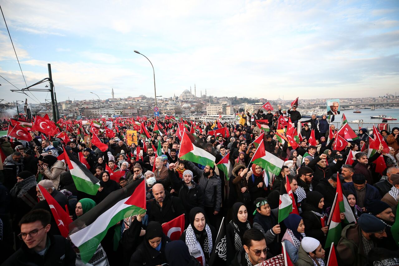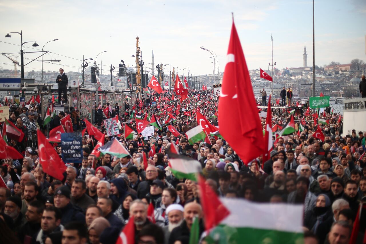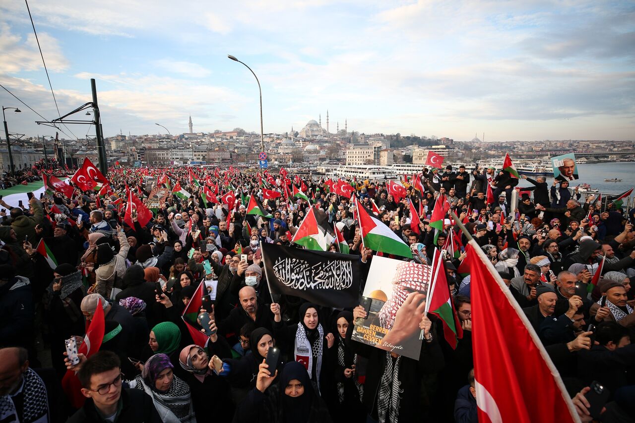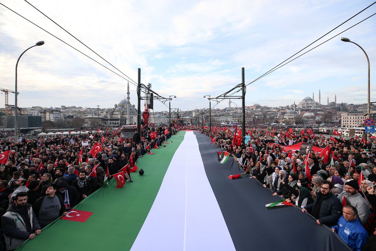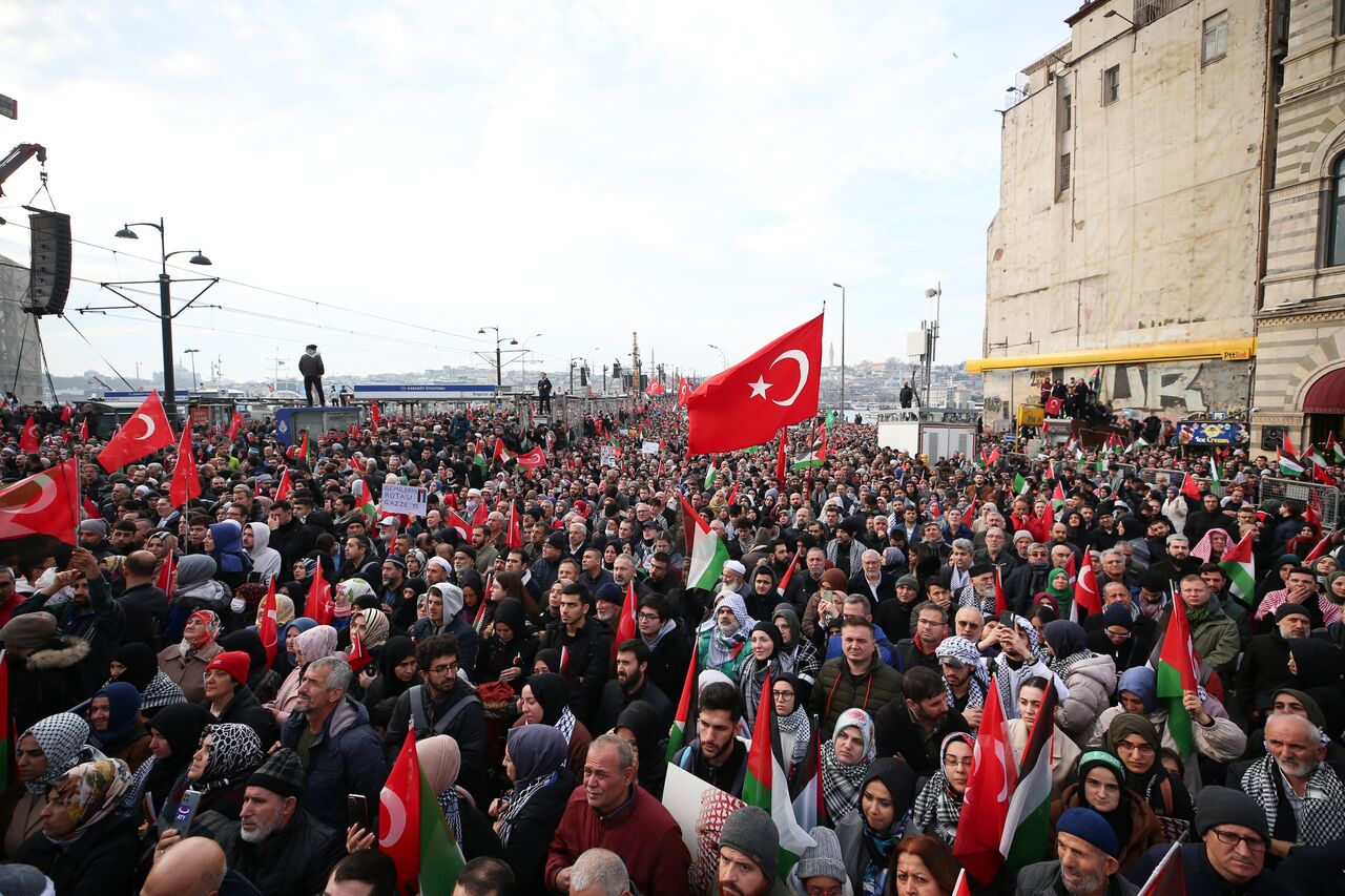 Türkiye Gençlik Vakfının (TÜGVA) öncülüğünde, Milli İrade Platformu tarafından 308 STK'nin katılımıyla düzenlenen "Şehitlerimize Rahmet, Filistin'e Destek, İsrail'e Lanet" yürüyüşü için Galata Köprüsü'nde on binlerce kişi bir araya geldi.