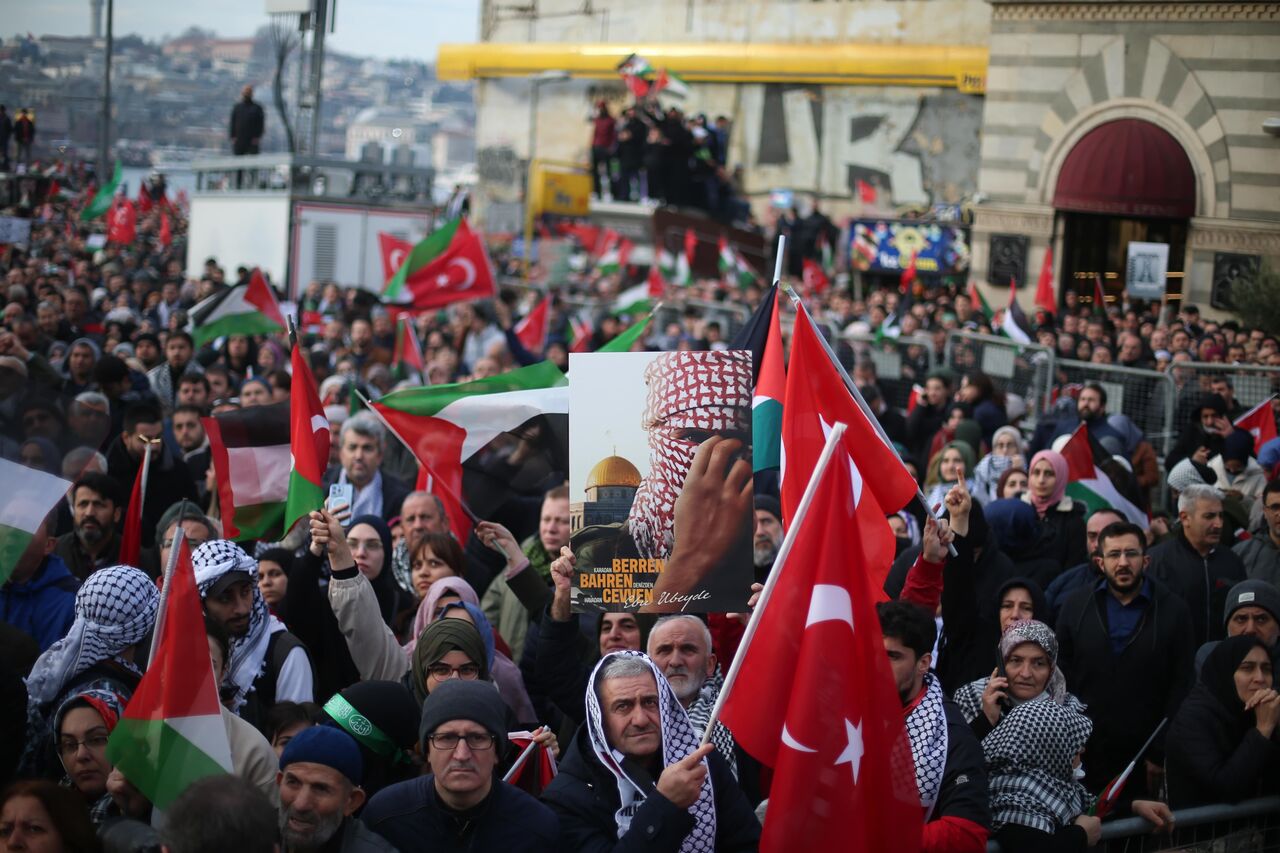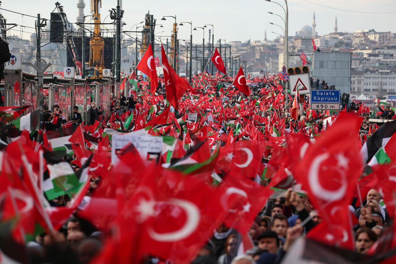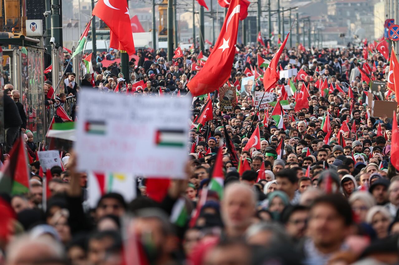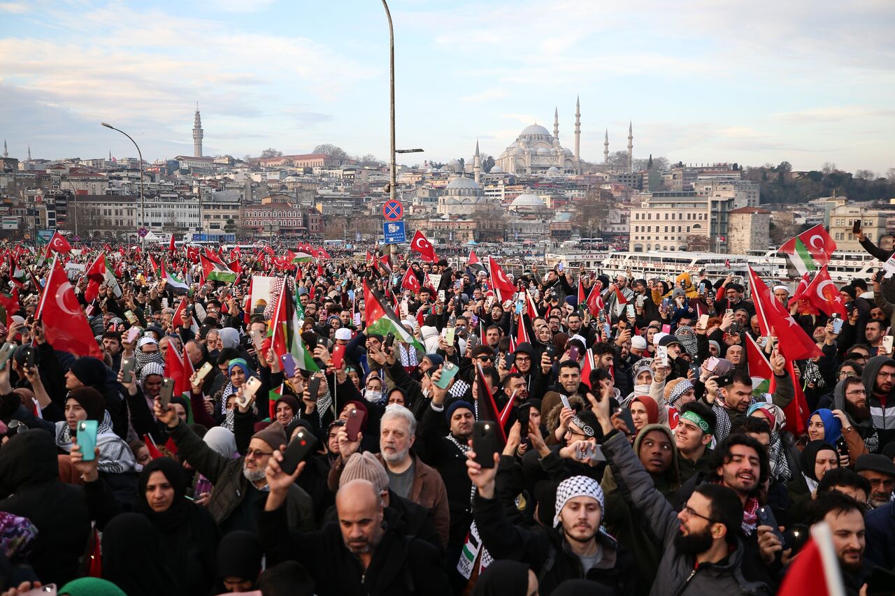 Türkiye Gençlik Vakfının (TÜGVA) öncülüğünde, Milli İrade Platformu tarafından 308 STK'nin katılımıyla düzenlenen "Şehitlerimize Rahmet, Filistin'e Destek, İsrail'e Lanet" yürüyüşü için Galata Köprüsü'nde on binlerce kişi bir araya geldi.