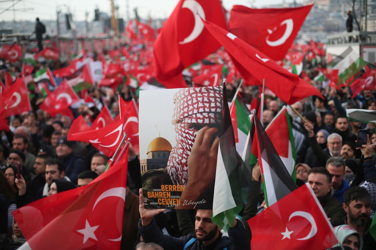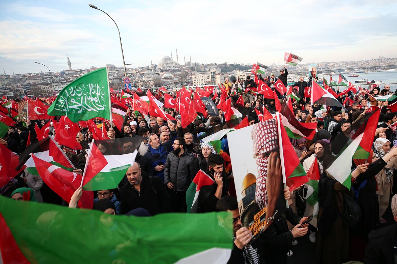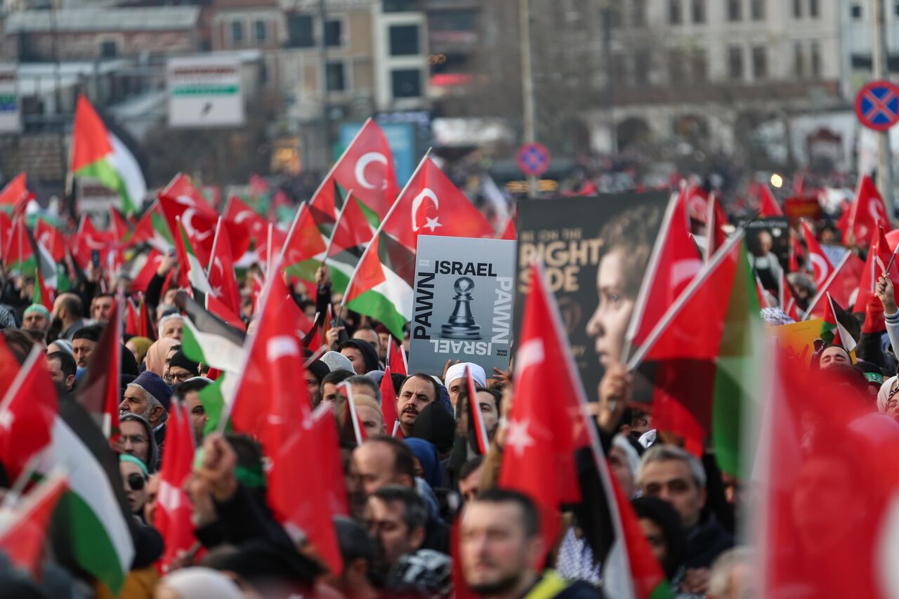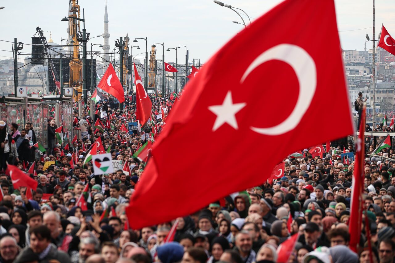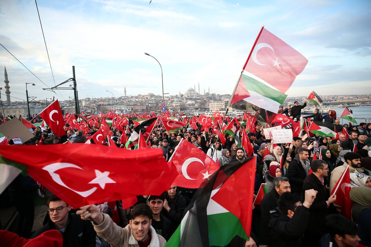 Türkiye Gençlik Vakfının (TÜGVA) öncülüğünde, Milli İrade Platformu tarafından 308 STK'nin katılımıyla düzenlenen "Şehitlerimize Rahmet, Filistin'e Destek, İsrail'e Lanet" yürüyüşü için Galata Köprüsü'nde on binlerce kişi bir araya geldi.
