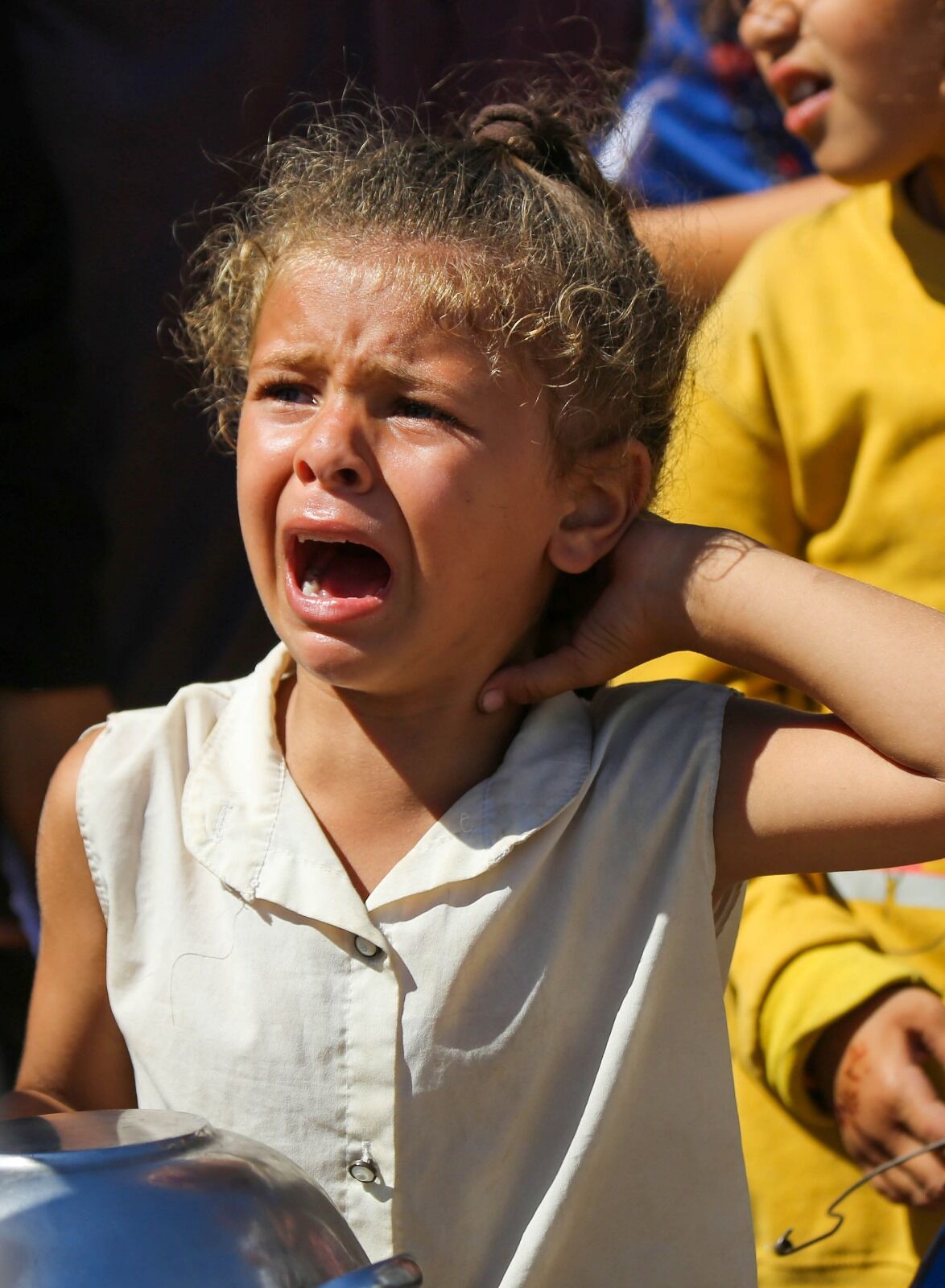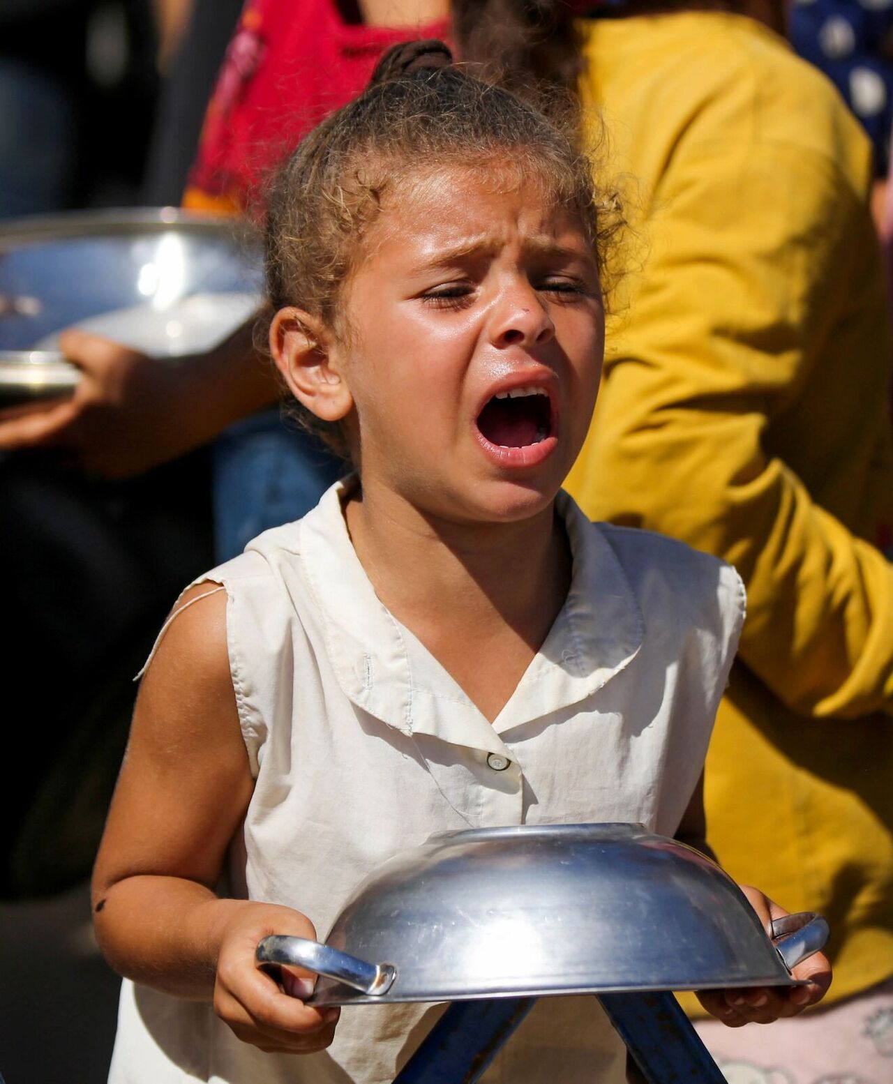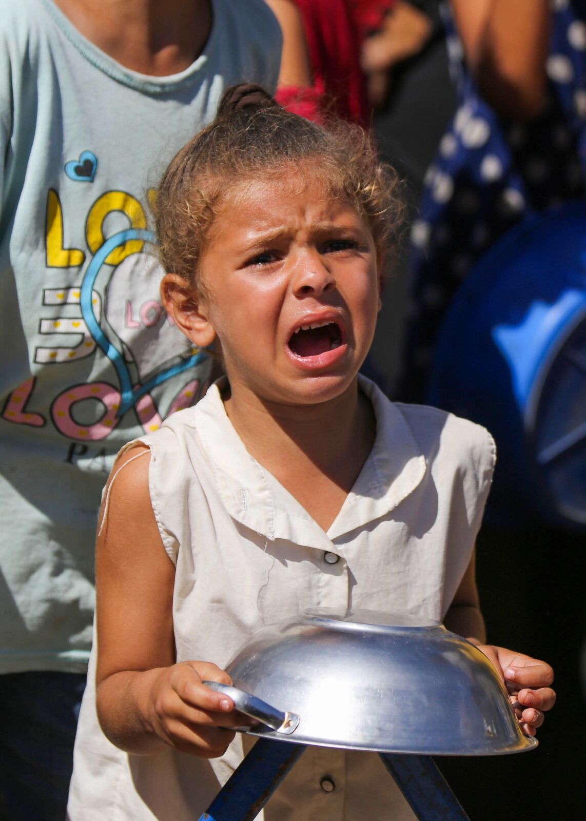 Deyr Belah kentindeki Filistinliler, hayır kurumlarının dağıttığı yemeklerden alabilmek için uzun süre kuyrukta bekledi. Kuyrukta bekleyen ve yemek alamayacağını düşünen Gazzeli bir kız çocuğun elinde boş tabağı taşıyarak ağlaması yürekleri burktu.