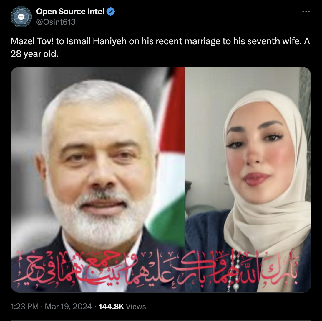 X'te Hamas lideri İsmail Haniyeh'in 8 Mart 2024'te Katar'da 18 yaşında biriyle evlenerek 7. düğününü gerçekleştirdiği ileri sürüldü.