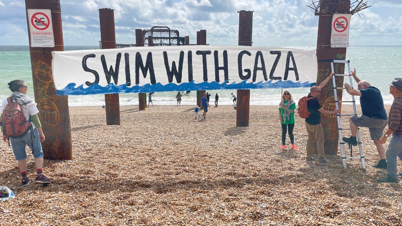 Gazze Şeridi'ndeki durumla ilgili farkındalık yaratmak amacıyla İngiltere'nin Brighton kentindeki Brighton Plajı'nda "Dünya Gazze ile Yüzme günü" kapsamı altında yüzme etkinlikleri yer aldı.