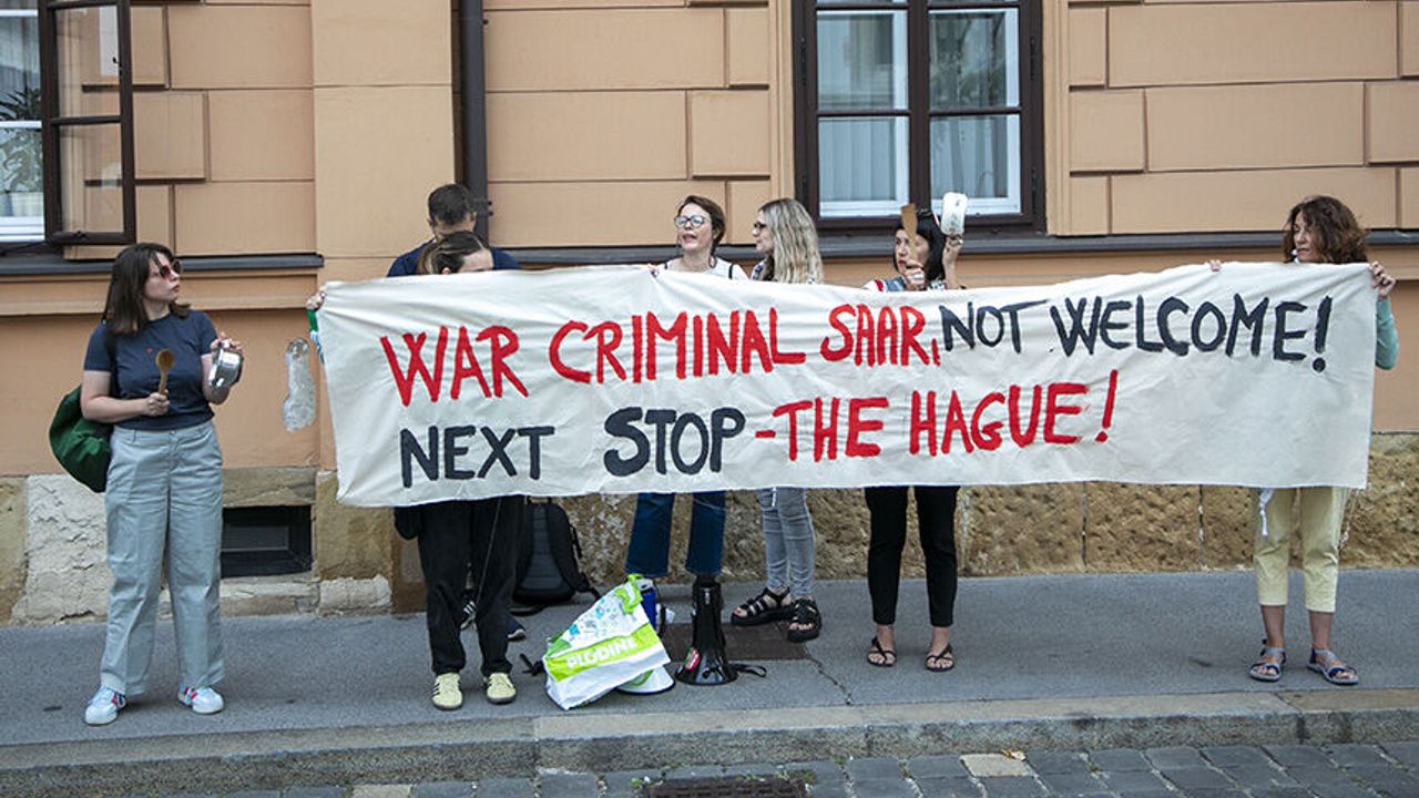 Hükümet binasın önünde bir araya gelen bir grup, İsrail'in Gazze'de işlediği soykırım suçunu protesto ederek, Saar'a yönelik "savaş suçlusu Saar, hoş gelmedin, bir sonraki durak Lahey" yazılı pankart açtı.