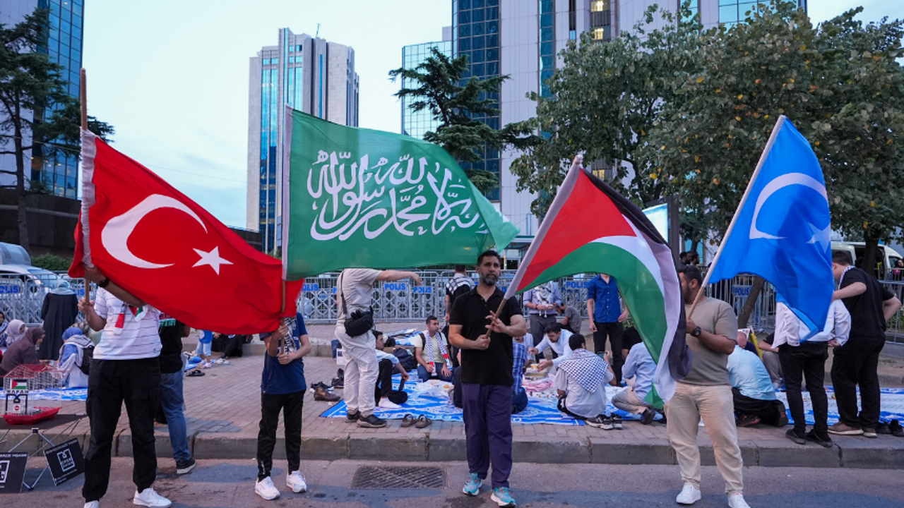 Levent'teki konsolosluk binası önünde toplanan grup, kaldırımda akşam namazını kıldıktan sonra sloganlarla Filistin'e desteklerini iletti.