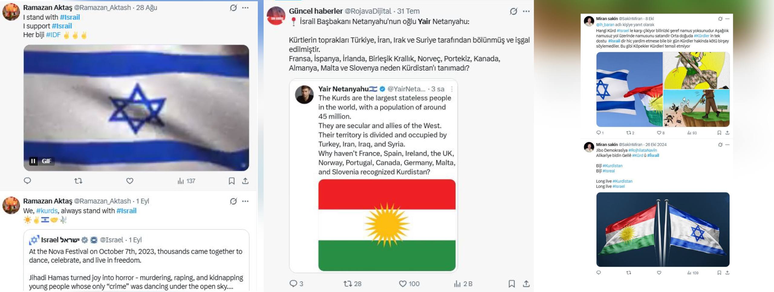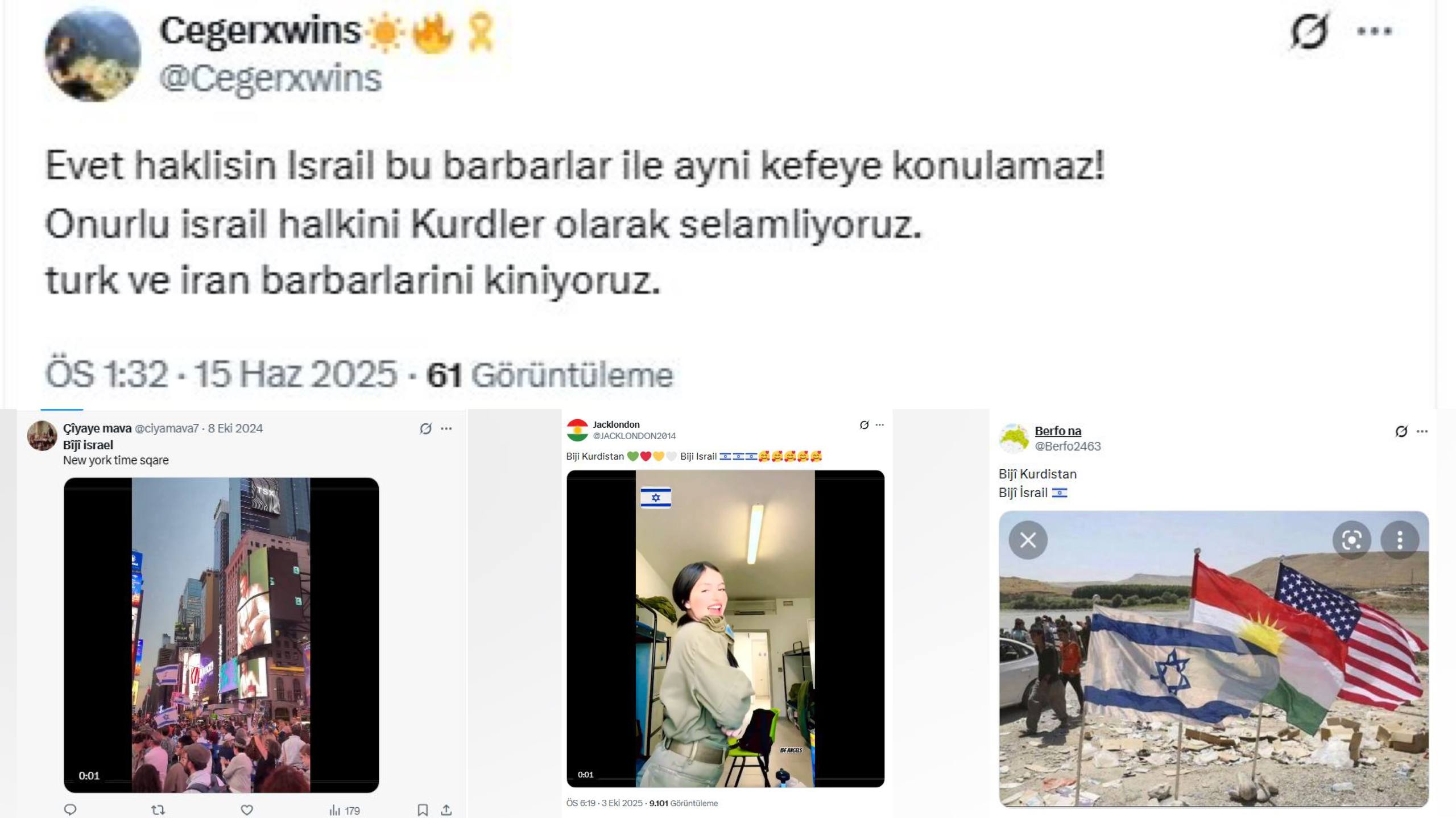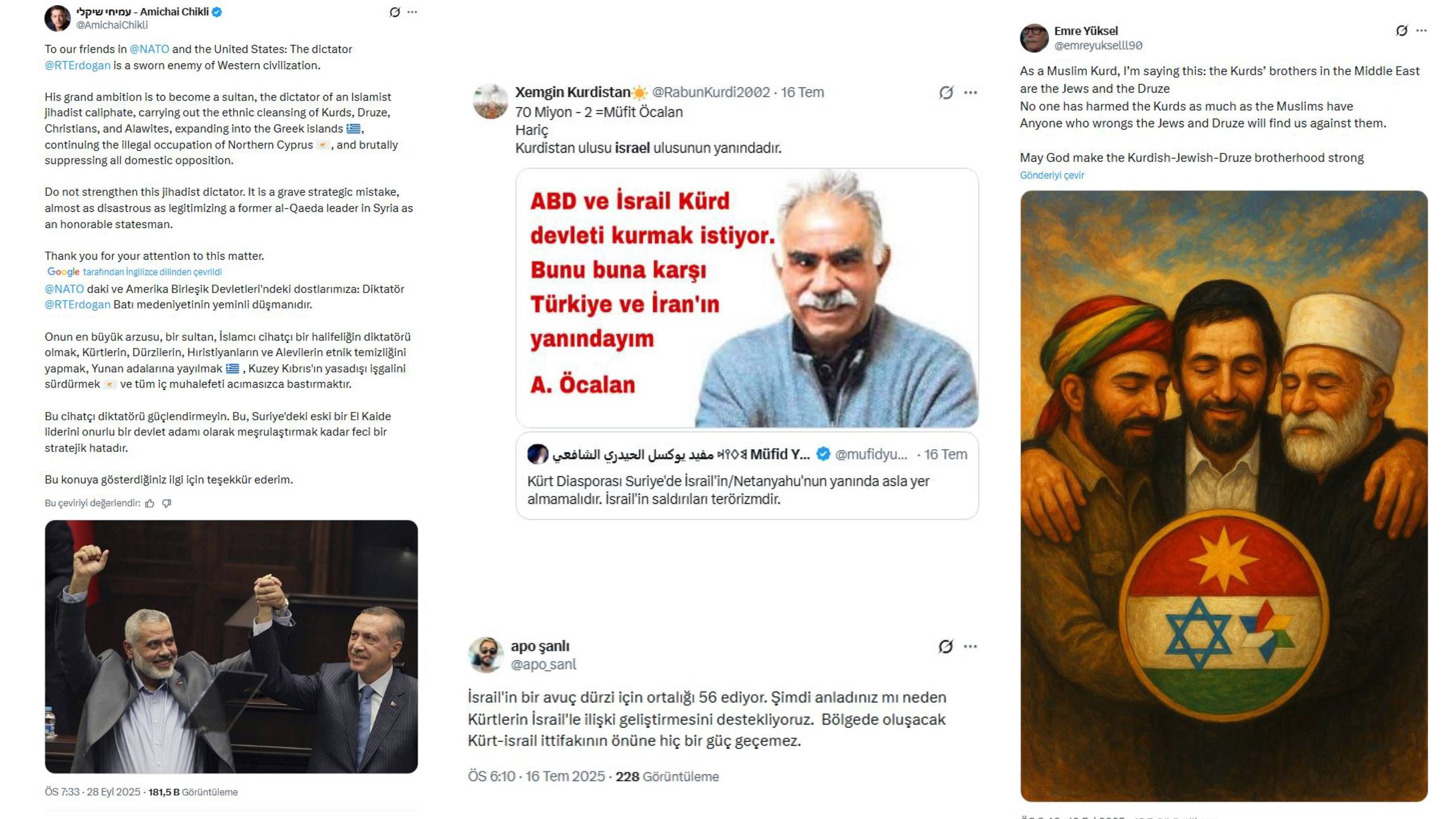 PKK'ya silah bırakma çağrılarının yoğunlaştığı dönemden itibaren İsrail'in sosyal medya faaliyetleri mercek altına alındı. İncelemede, 60 civarında "Kürdistan destekçisi" hesabın organize bir şekilde, soykırımcı İsrail yanlısı ve benzer söylemleri kullandığı tespit edildi. Bu hesapların, özellikle PKK'nın Türk devletiyle diyalog kurmasından rahatsızlık duyan Kürt profilleriyle irtibat kurularak İsrail gözetiminde kurulduğu ve yönlendirildiği iddia ediliyor.