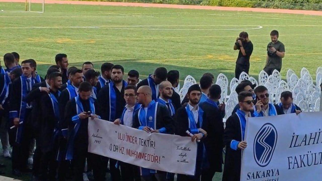 Sakarya Üniversitesi İlahiyat Fakültesi mezuniyet töreninde öğrenciler, "Ulu önder tektir; o da Hz.Muhammed'dir.” yazılı pankartla alana giriş yaptılar.