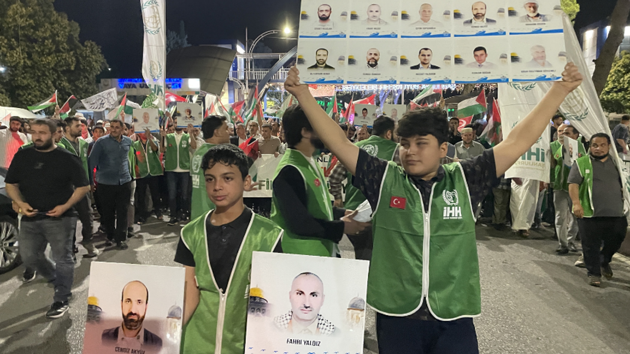Tekbir getiren kalabalık, "Hamas'a selam direnişe devam" sloganı attı, "Özgür Filistin", "Filistin'in özgürlüğü insanlığın vicdanıdır" ve "Bir ölür bin diriliriz" dövizleri taşıdı.