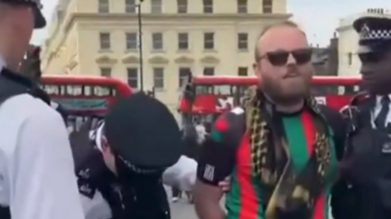 Filistin’e destek eylemine katılan İngiliz bir genç, gözaltına alındığı sırada “Çok yaşa Gazze, çok yaşa Filistin!” diye haykırarak direnişini sürdürdü.